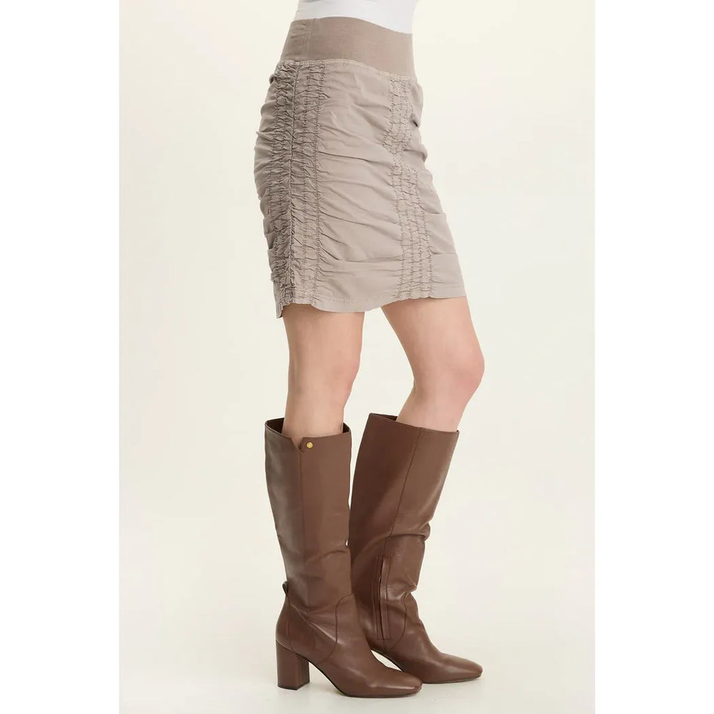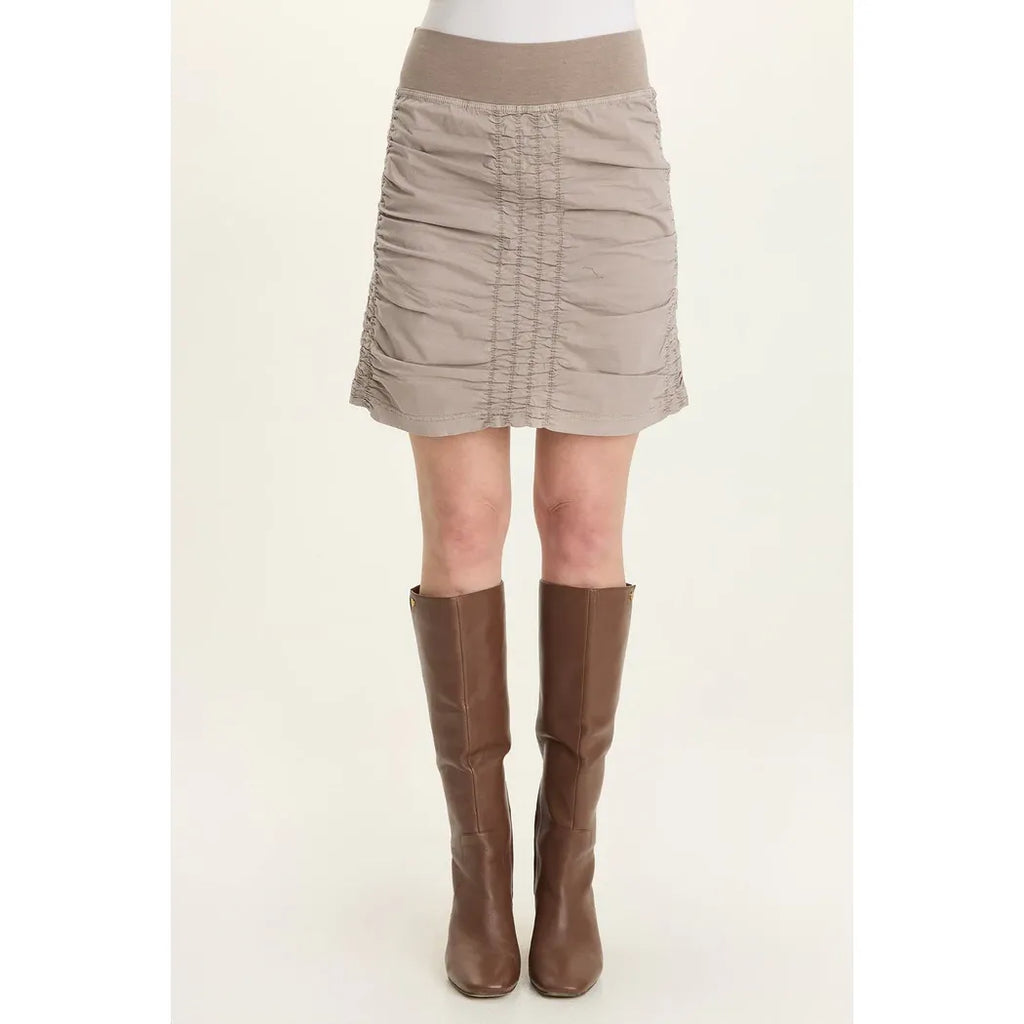 Just slide it on and go! Sporty style skirt featuring a pull on jersey waistband and ruching at sides, front and back for a flattering look. Nothing says cool and comfort like cotton/spandex. You will want one in every color! Pairs beautifully with the Wexel Jacket in Foxglove Grey.