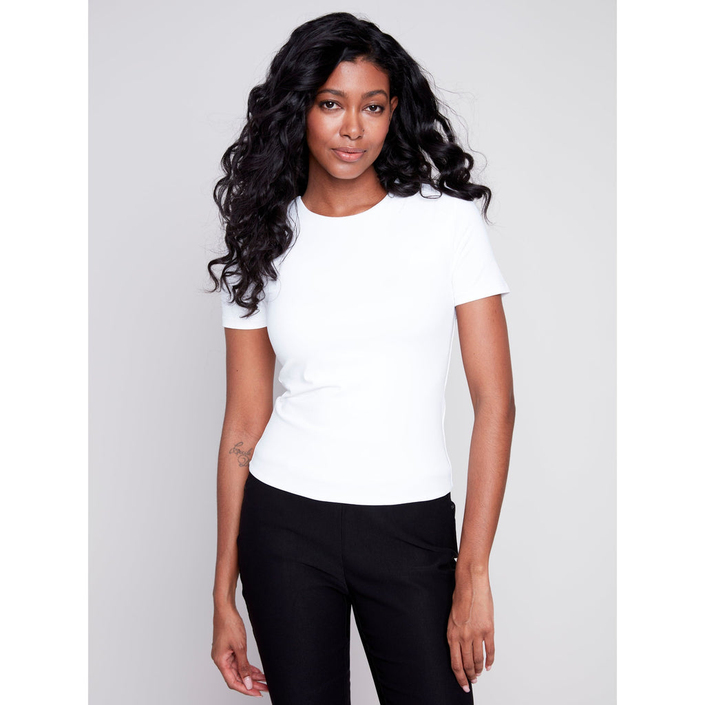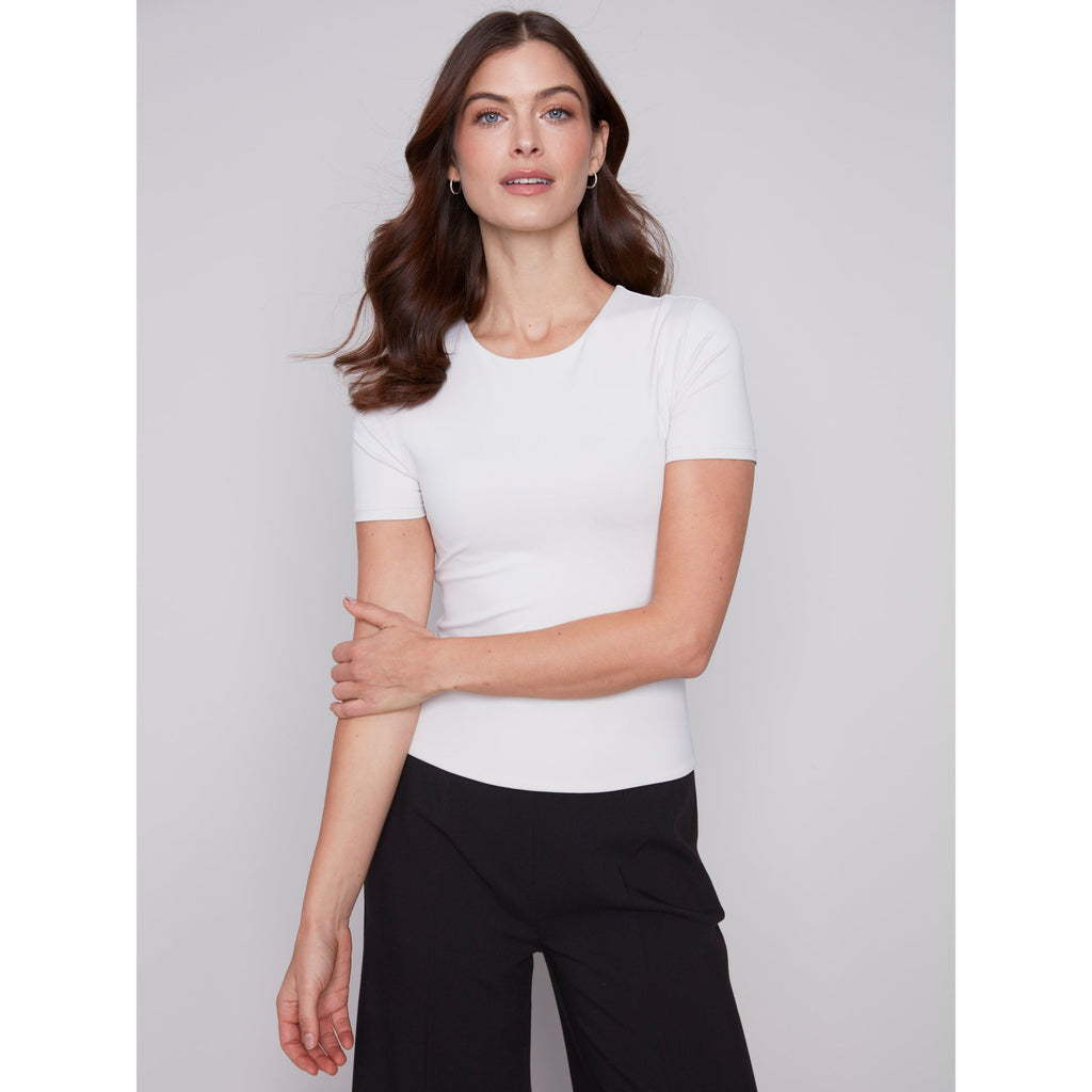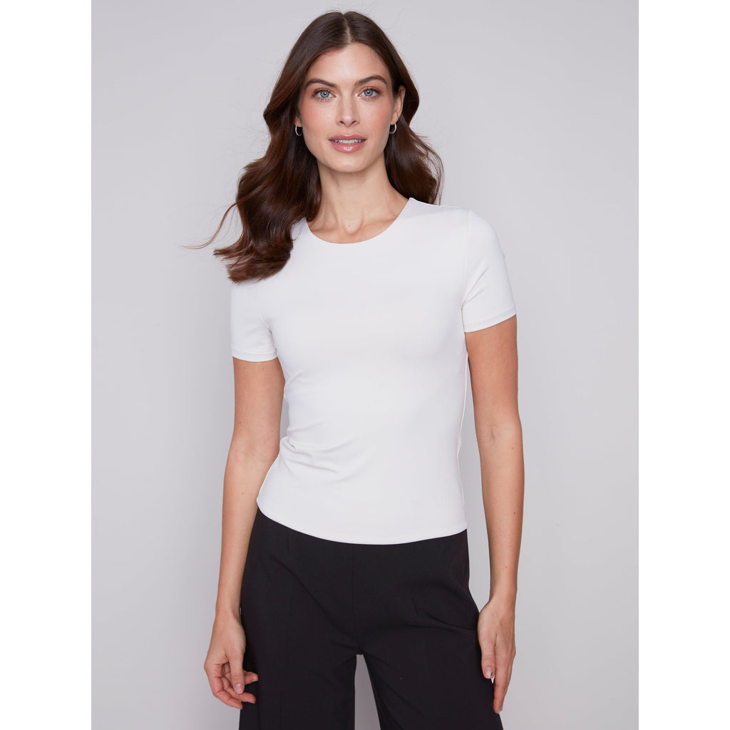 Introducing the Super Stretch Fitted Top, your go-to for stylish yet comfortable spring and summer days. With its super stretchy, double layer fabric, this short-sleeved women's top is perfect for any occasion. Choose from a variety of colors, including a crisp White option. Stay on-trend with classic T-shirt vibes and endless comfort.  One of our most requested tops!!
