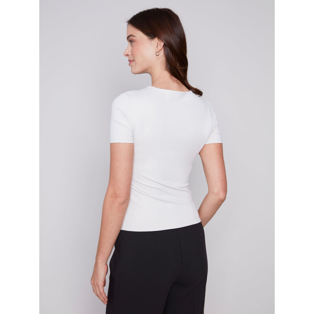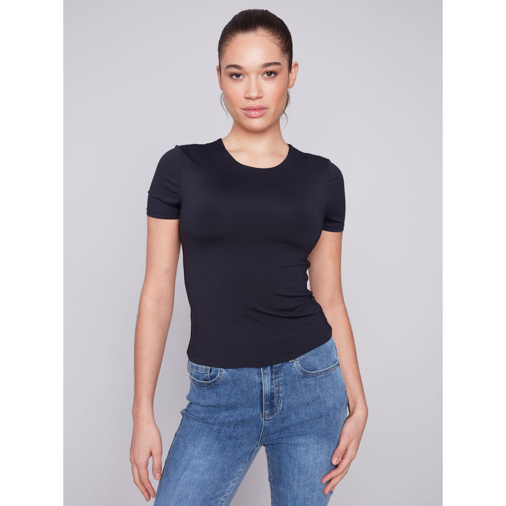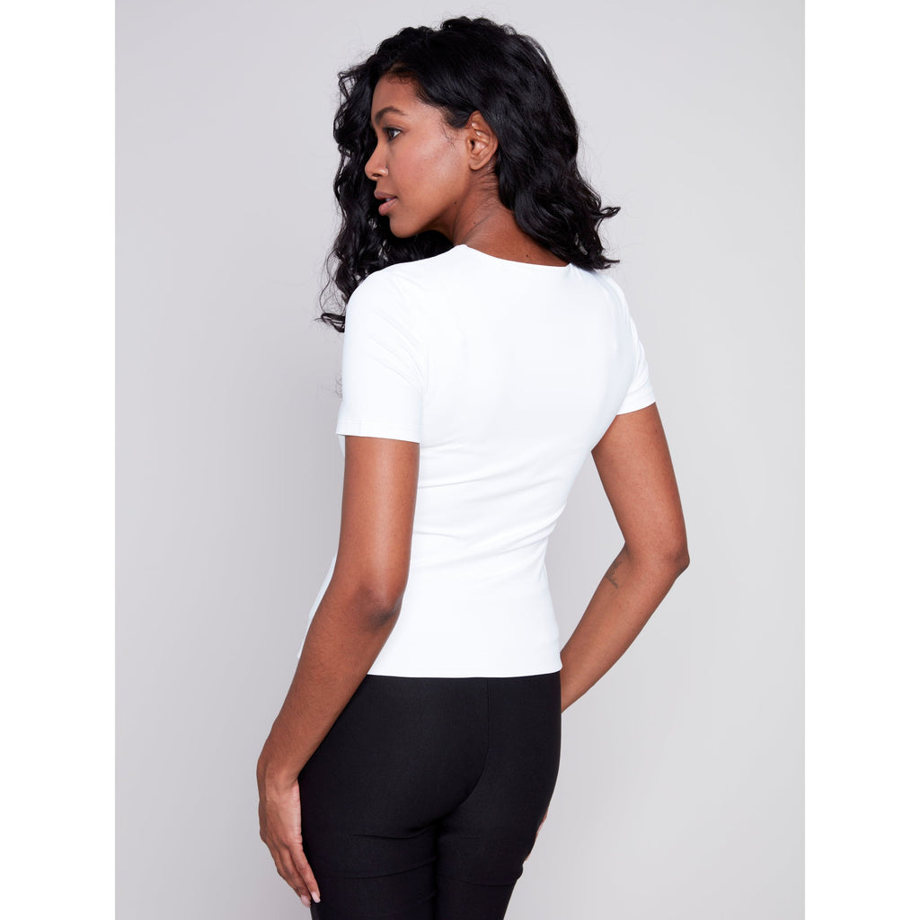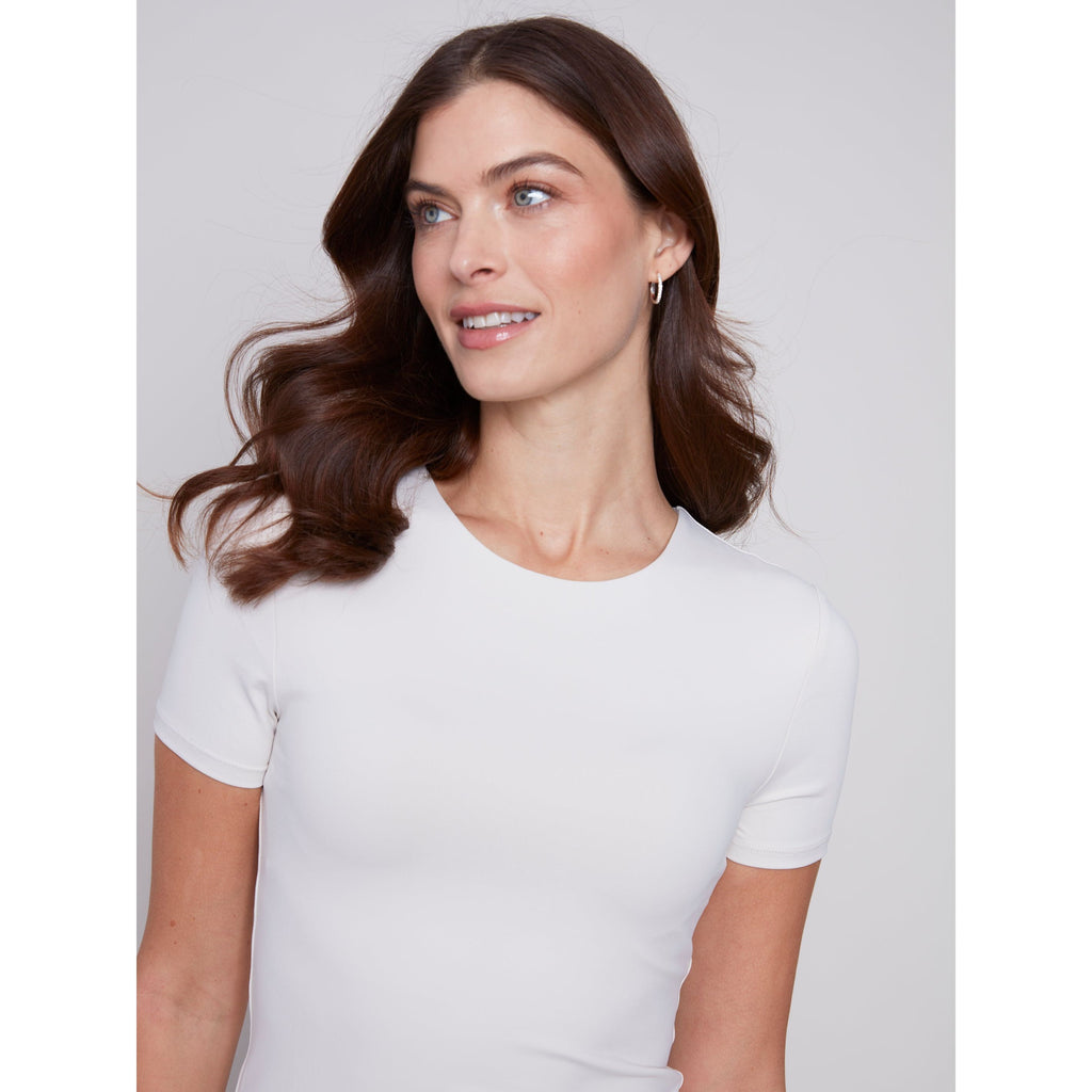 Introducing the Super Stretch Fitted Top, your go-to for stylish yet comfortable spring and summer days. With its super stretchy, double layer fabric, this short-sleeved women's top is perfect for any occasion. Choose from a variety of colors, including a crisp White option. Stay on-trend with classic T-shirt vibes and endless comfort.  One of our most requested tops!!