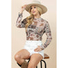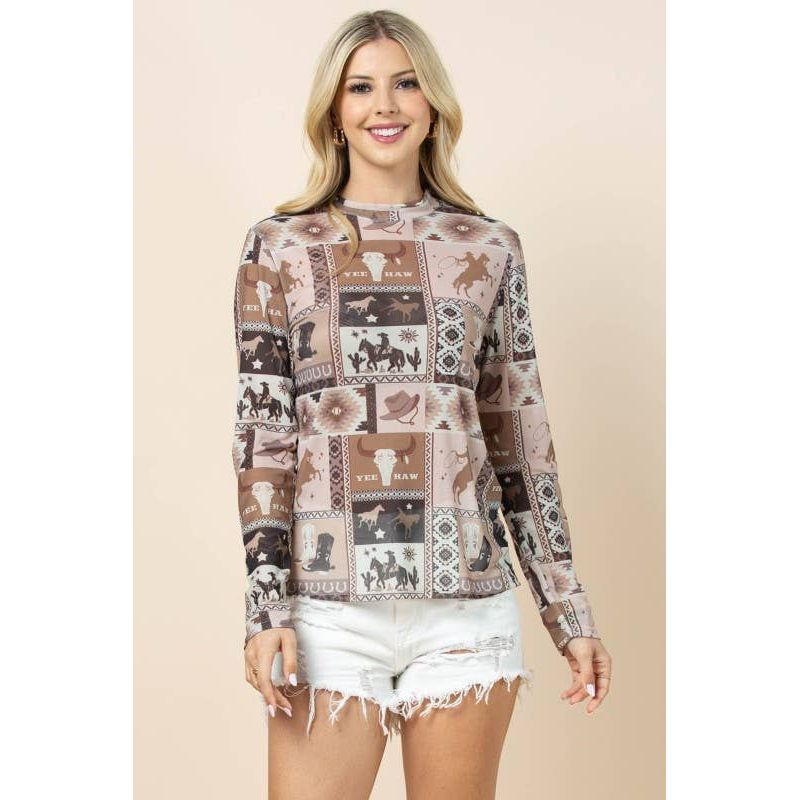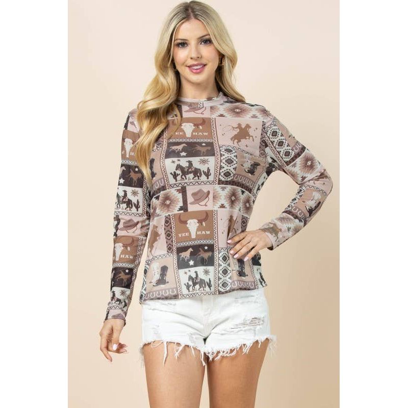 Saddle up for effortless style with this Western Print Relaxed Fit Top. Featuring a charming western print and semi-sheer mesh fabric, this piece brings a touch of cowgirl cool to your everyday rotation. The mock neck and long sleeves offer just enough coverage, while the relaxed fit keeps things comfy and breezy. Perfect for layering or wearing solo, it's your new go-to for casual days with personality.