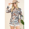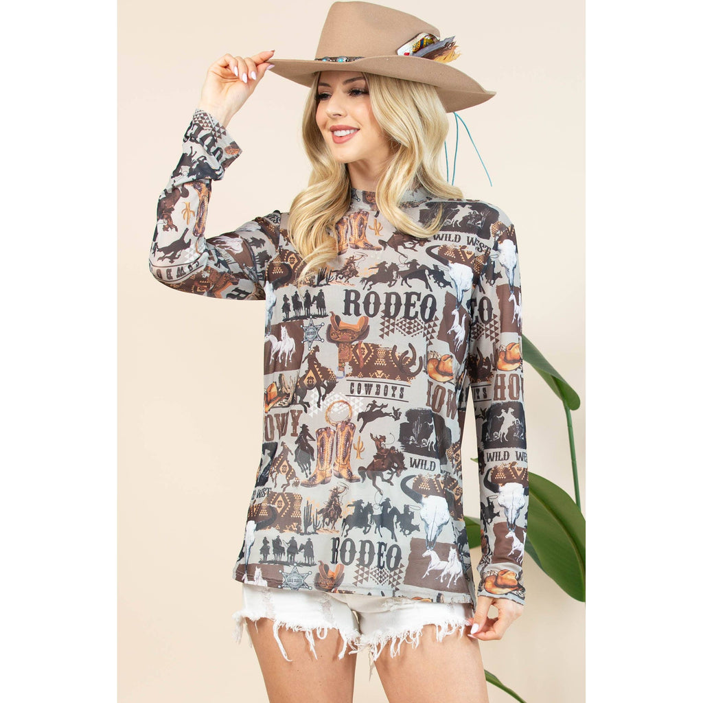 Saddle up for some serious style with this Western rodeo print mesh top! The semi-sheer fabric and long sleeves give you that effortless, laid-back vibe perfect for showing off your bold personality. Whether you're heading to a music festival, casual night out, or just want to channel your inner cowgirl, this playful piece delivers Western charm with a modern twist. Layer it over your favorite basics or wear it solo for maximum impact. Yeehaw!