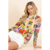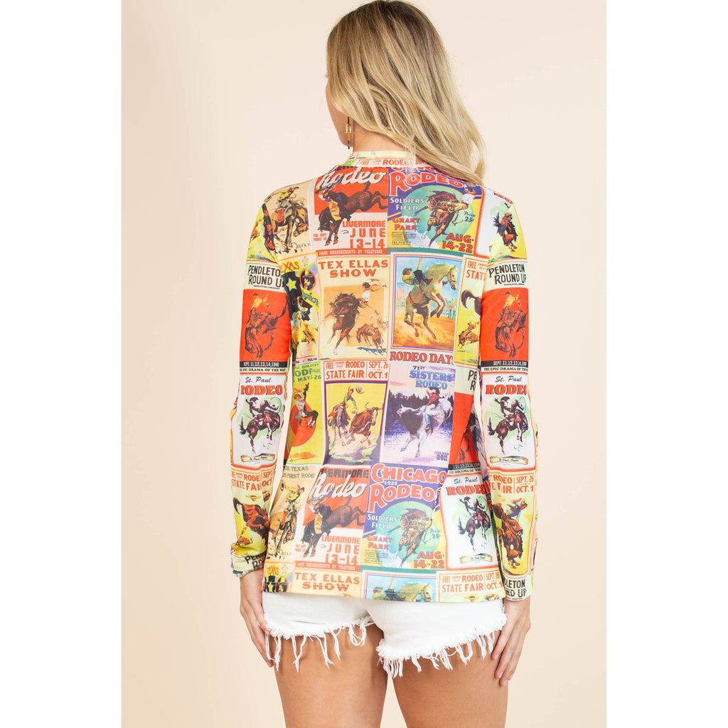 Channel your inner cowgirl with this playful vintage Western print mesh top! The semi-sheer fabric and mock neck create an effortlessly cool vibe, while long sleeves keep things modest and chic. Perfect for layering over a cami or rocking solo for that perfectly edgy look. Whether you're heading to a rodeo-themed night out or just want to add some Western flair to your everyday rotation, this piece delivers retro charm with modern attitude.