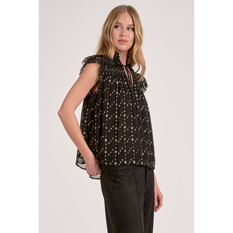 Elevate your holiday wardrobe with this stunning blouse that strikes the perfect balance between elegance and fun. The lightweight, chiffon-inspired fabric showcases eye-catching gold geometric patterns that catch the light beautifully. Playful flutter sleeves frame the shoulders while delicate smocking across the chest and upper back adds texture and dimension. Complete with a charming neck-tie detail, this piece brings just the right amount of sparkle to your seasonal celebrations.