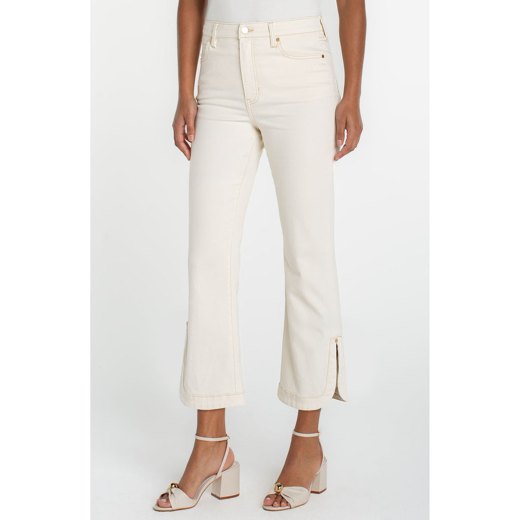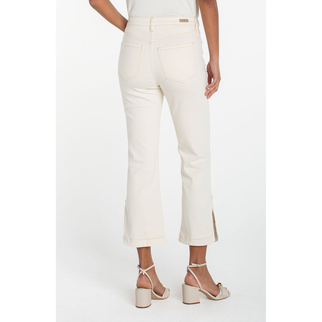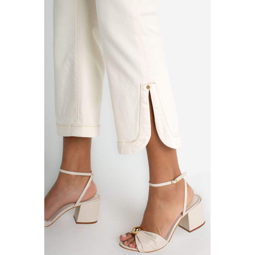 A modern crop flare designed with a subtle kick at the hem. The tulip hem adds soft shape and movement, giving this classic silhouette a fresh update. Polished with structure, easy with stretch. Style it with the matching collarless jacket for a coordinated, statement set.