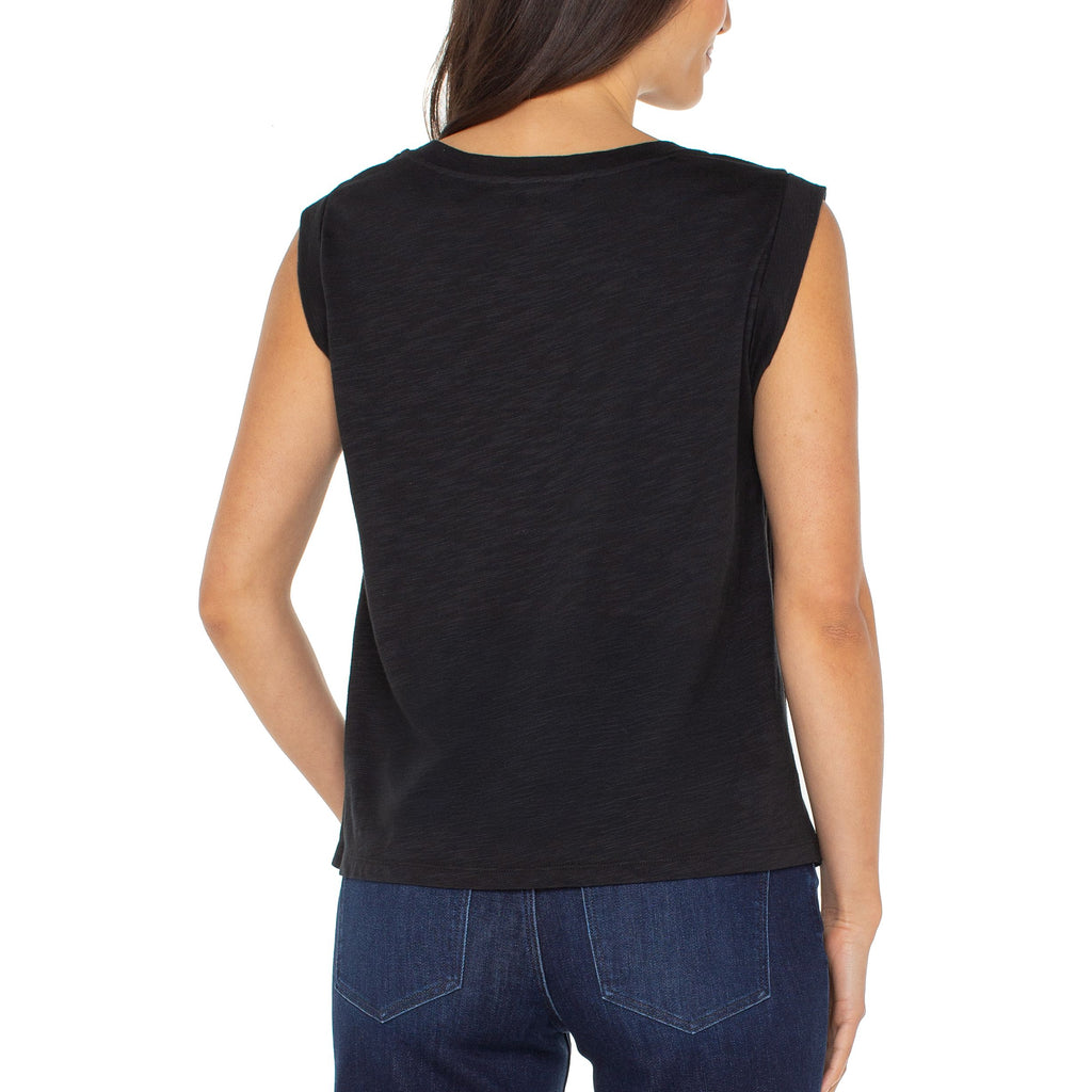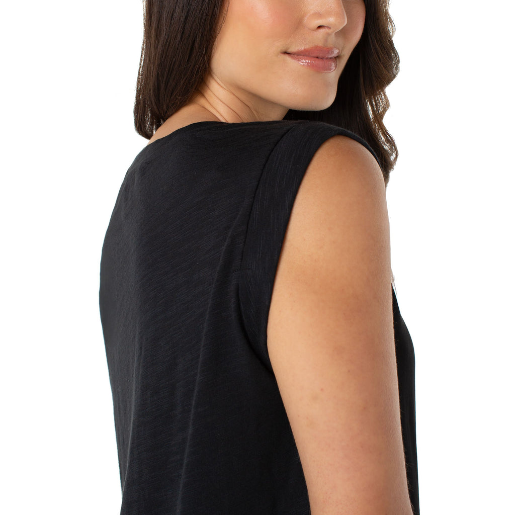 Where sophistication flirts with comfort. This sleeveless top combines a crisp woven front for a sharp silhouette with a cozy knit back that stretches as you move. The outcome? A playful staple that mixes textures and ease—ready to take you from morning meetings to moonlit fun with style.