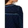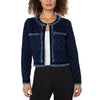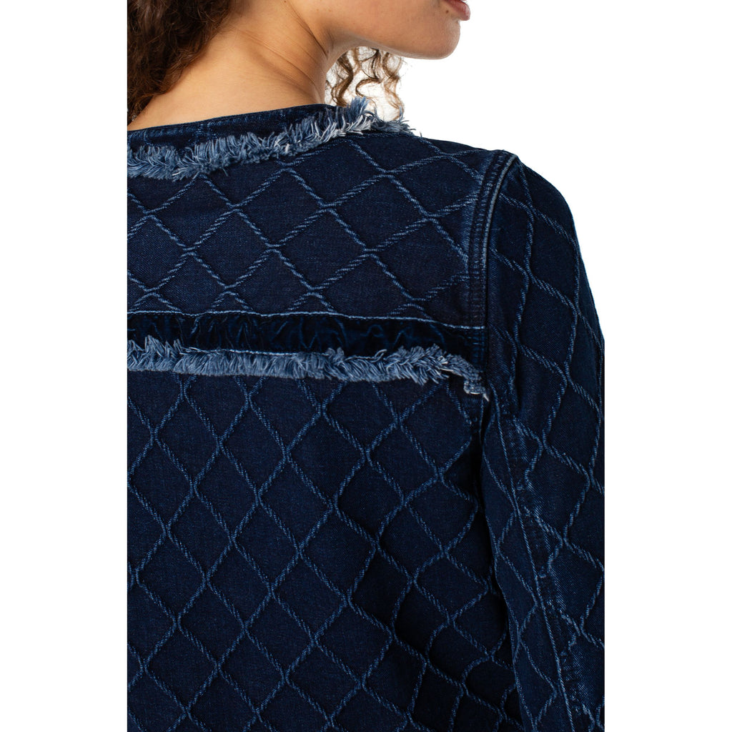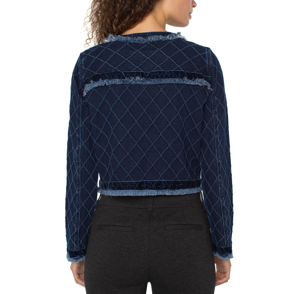 A fresh twist on a timeless classic. This chic jacket is crafted from lightweight, soft denim with just the right amount of stretch for a comfortable, flattering fit. The quilted diamond pattern adds texture and sophistication, while the frayed edges and velvet trim bring a touch of modern edge. Features hidden hook-and-eye closures for a clean silhouette and functional chest pockets for added style and practicality. Perfect for pairing with your favorite denim, trousers, or a sleek midi skirt—effortlessly elevating any look.