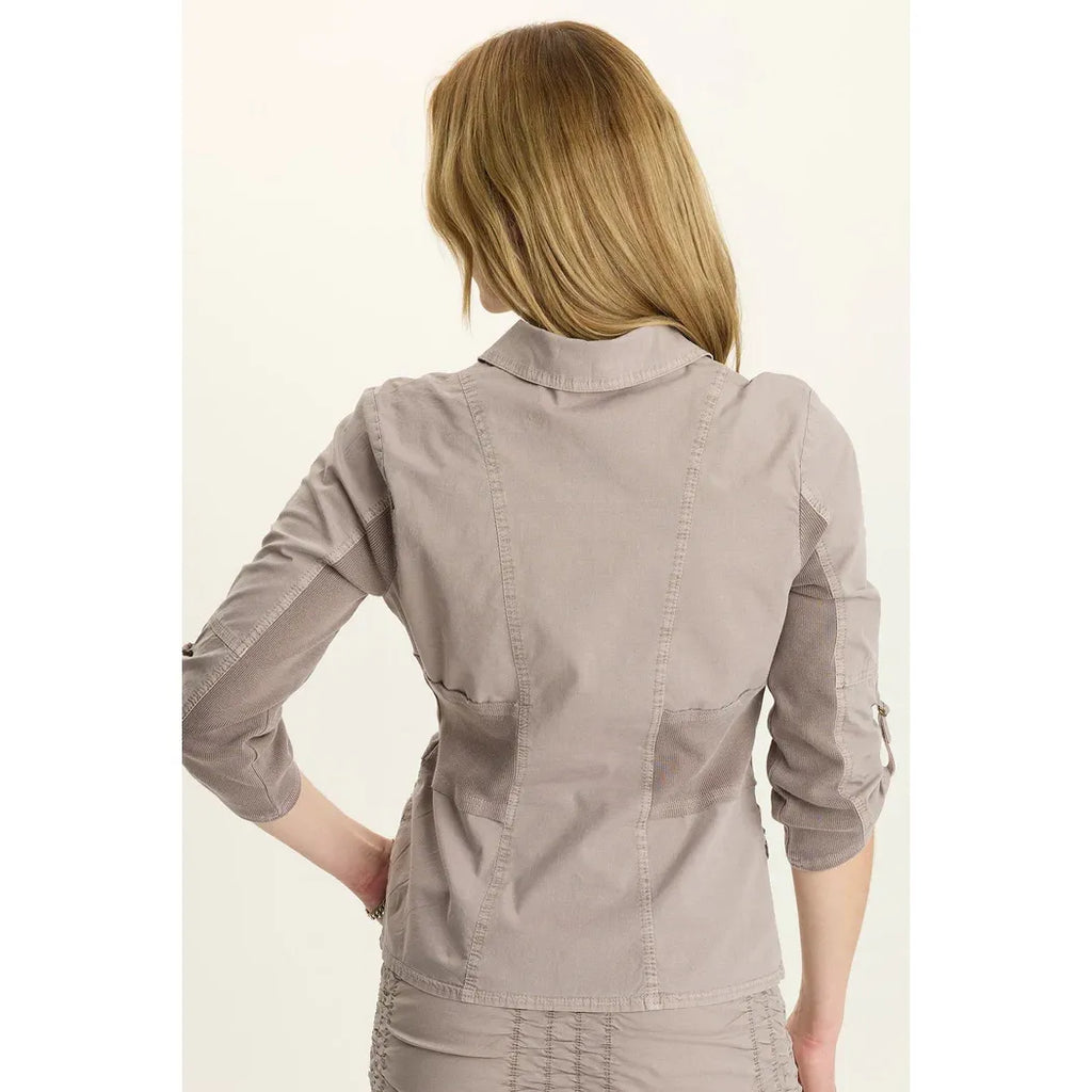 Crafted from our signature poplin fabric, the Wexel Stretch Poplin Fitted Cargo Jacket in Foxglove offers a refined silhouette with tailored details. Featuring a timeless collar, antique brass zipper pull, and twill tape accents on the pockets, this jacket blends elegance with subtle vintage charm. Contrasting panels at the waist and under the sleeves enhance flexibility for comfortable movement. It balances sophistication and functionality for a polished, versatile look. Pair it with the matching trace skirt or the faulkner crop pant in Foxglove Grey.