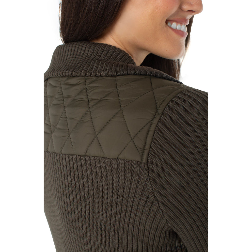Effortless style meets cozy comfort in this versatile sweater jacket. Featuring a quilted front for a touch of structure, and ribbed knit back, sleeves and trim for warmth and stretch, it’s the perfect balance of casual and polished. Functional pockets in the front. The full zip front and stand collar add a modern, sporty edge—ideal for layering over your favorite tee or blouse for an easy, elevated look.
