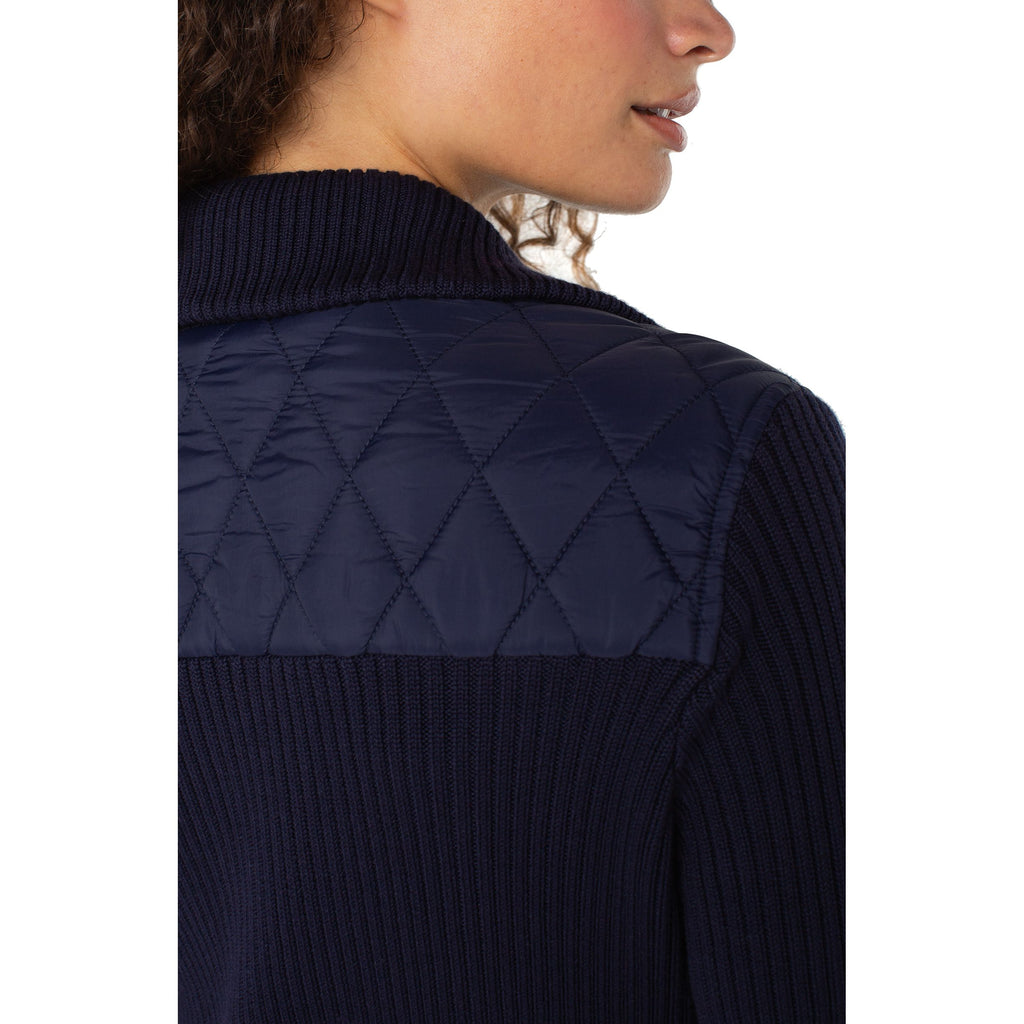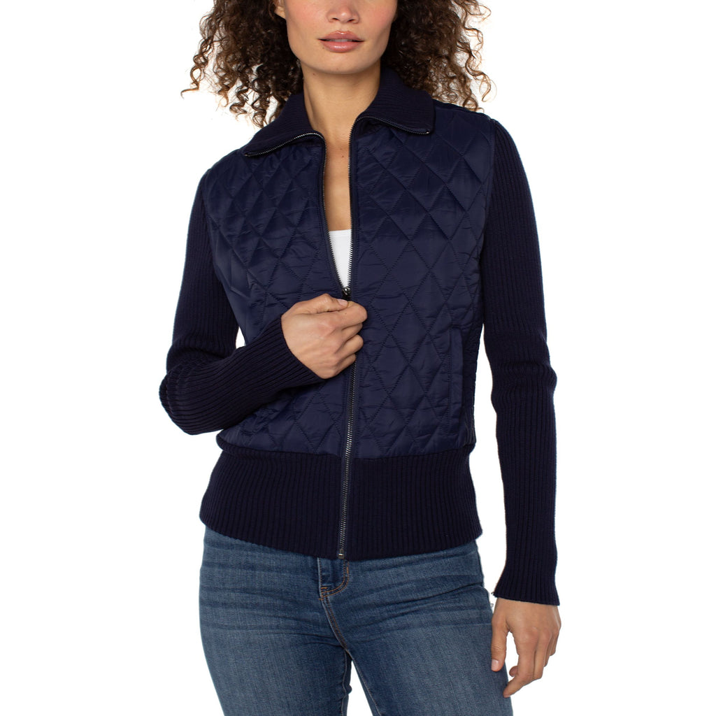 Effortless style meets cozy comfort in this versatile sweater jacket. Featuring a quilted front for a touch of structure, and ribbed knit back, sleeves and trim for warmth and stretch, it’s the perfect balance of casual and polished. Functional pockets in the front. The full zip front and stand collar add a modern, sporty edge—ideal for layering over your favorite tee or blouse for an easy, elevated look.