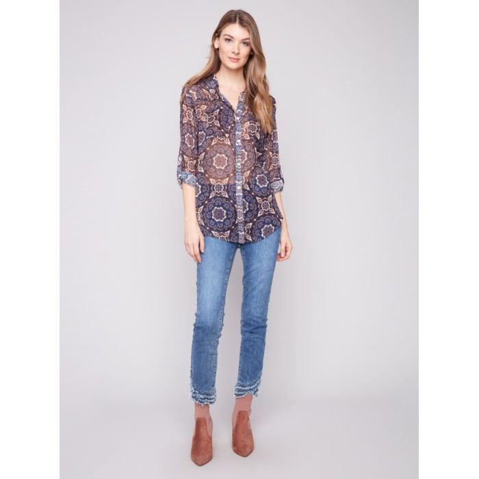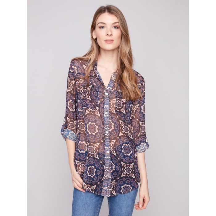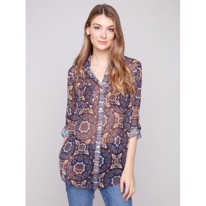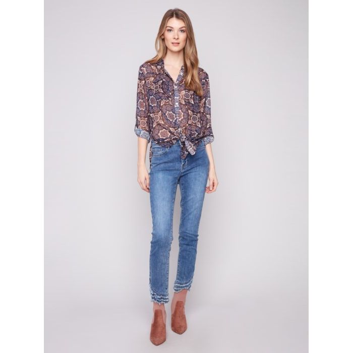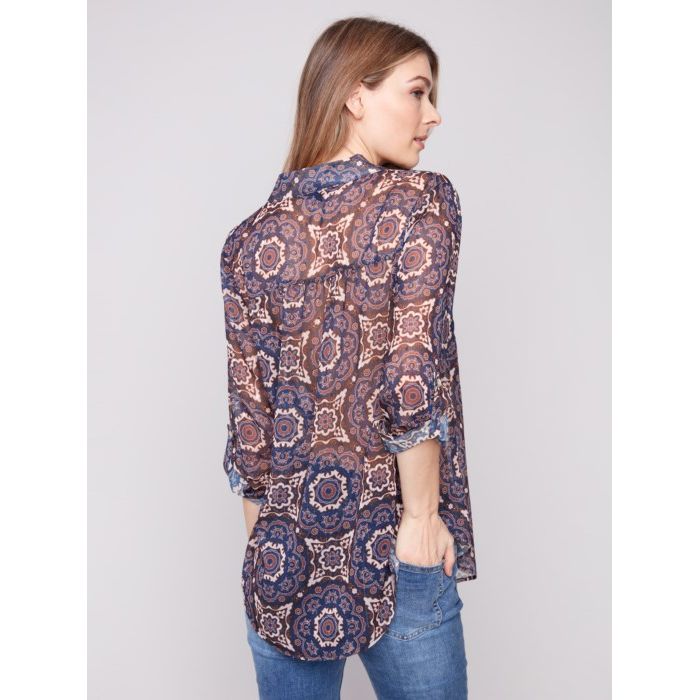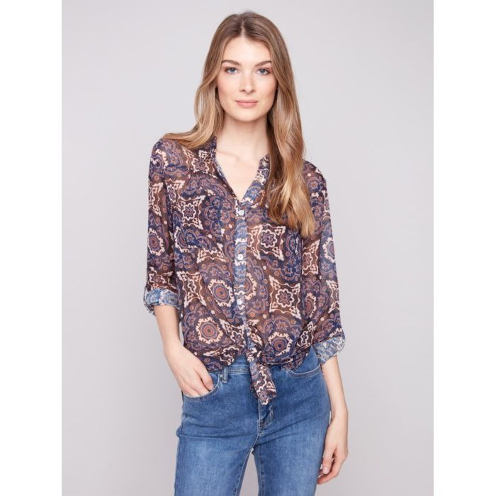 Elevate your autumn outfits with our charming printed button-up blouse, ideal for every event. Featuring a captivating medallion print, it spruces up your look with a playful vibe. Chic chest pockets and side slits bring a fresh, stylish twist, while the front tie lets you tailor the fit just right. Add a splash of fun and flair to your fall wardrobe with this must-have piece!