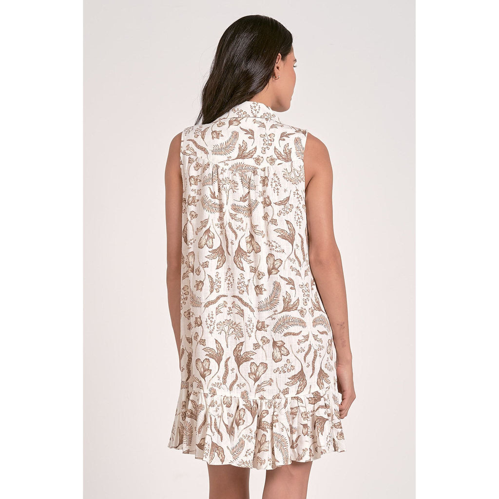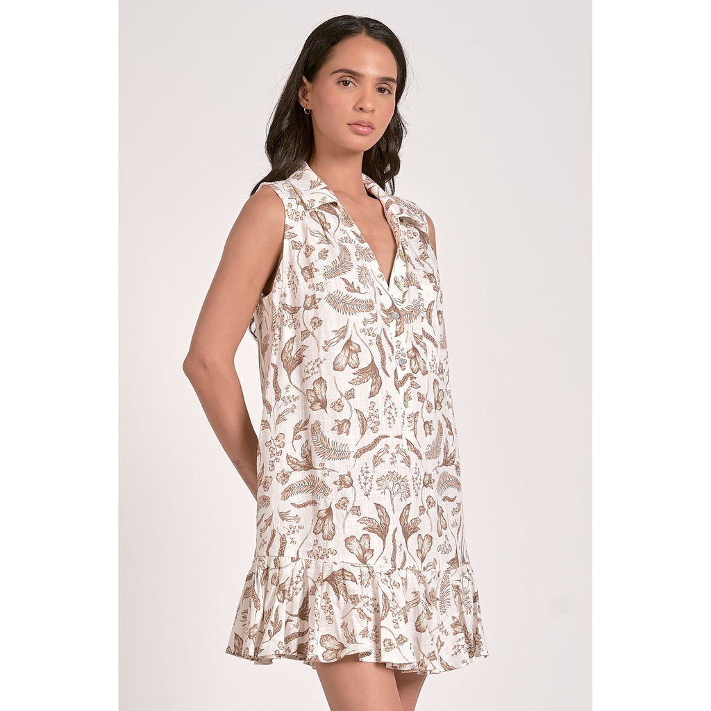 This lovely little sundress is polished casual perfection! Made in a light and airy linen blend fabric with a brown and beige 'porcelain' print. Features a button up front with collar, a ruffle tiered hem, a chest pocket, and a yoke in the back.