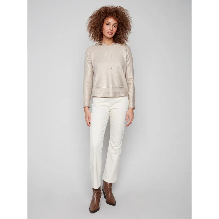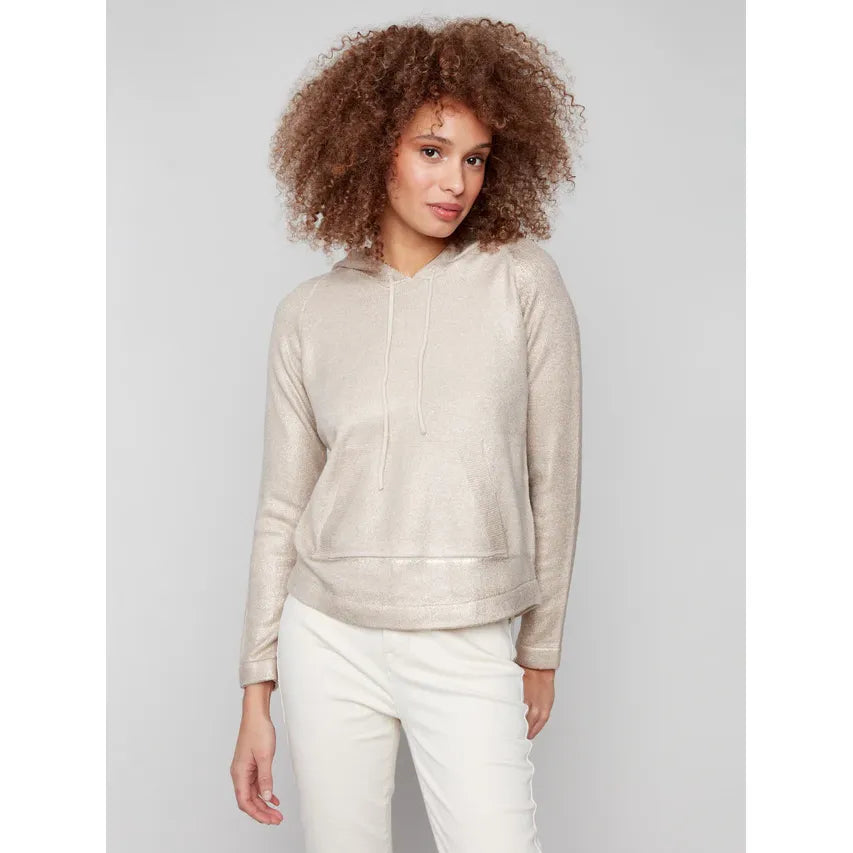 Effortlessly shine this fall with this Metallic Knit Hoodie Sweater in a beautiful champagne beige color. Its soft texture and gentle shimmer make it a standout top in any wardrobe. Ideal for bringing elegance to your everyday look, its long sleeves and adjustable hood offer both comfort and style.