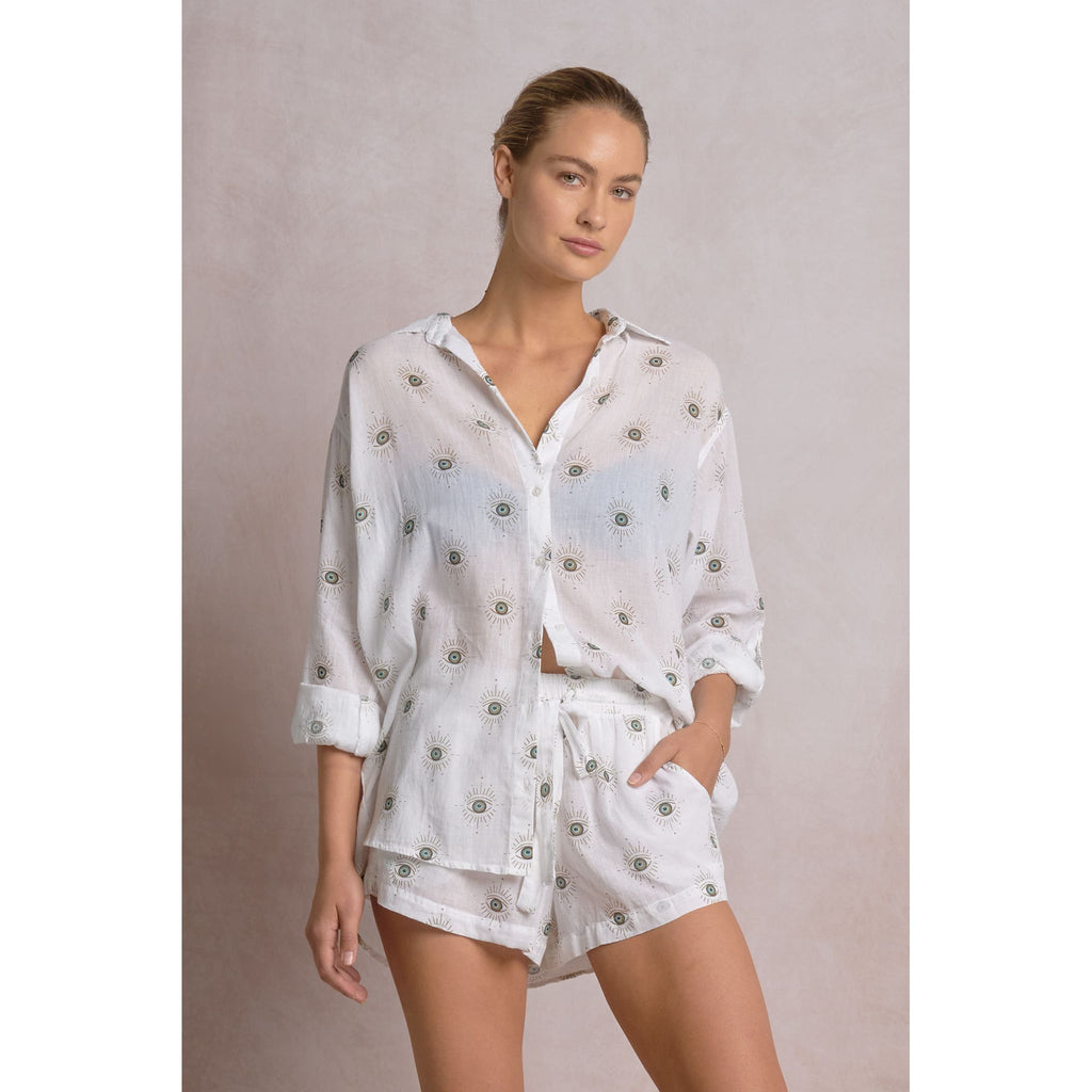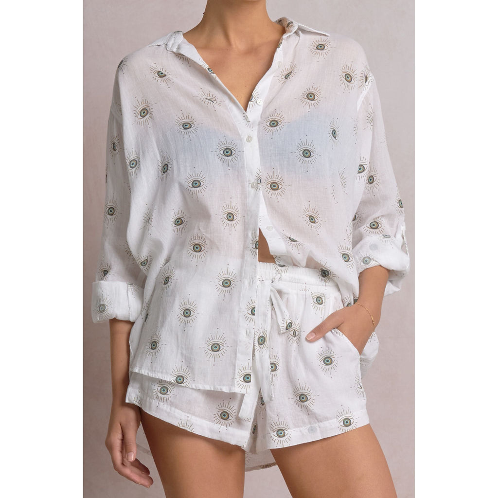 Slip into this charming button-up blouse featuring an eye-catching evil eye motif that's sure to turn heads. The crisp cotton construction keeps you cool and comfortable all day long, while the classic collar and long sleeves offer timeless style. Roll up the sleeves whenever you want a more casual vibe, or keep them down for polished sophistication. Layer it over a tee or wear it solo—this versatile piece adapts to your mood and your wardrobe.