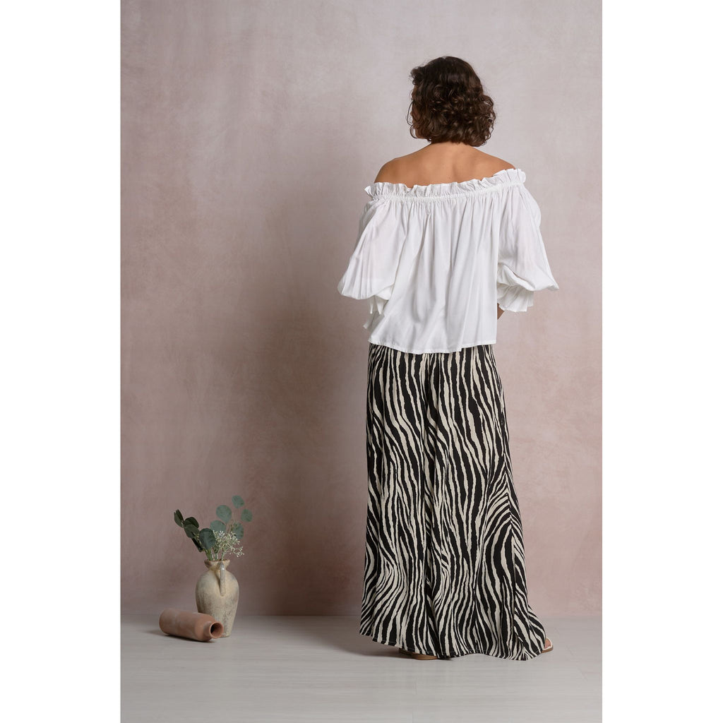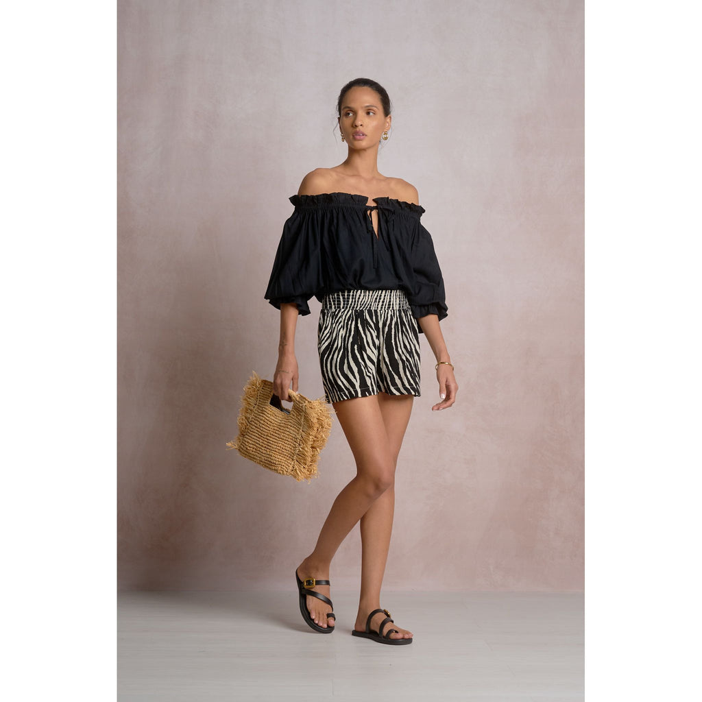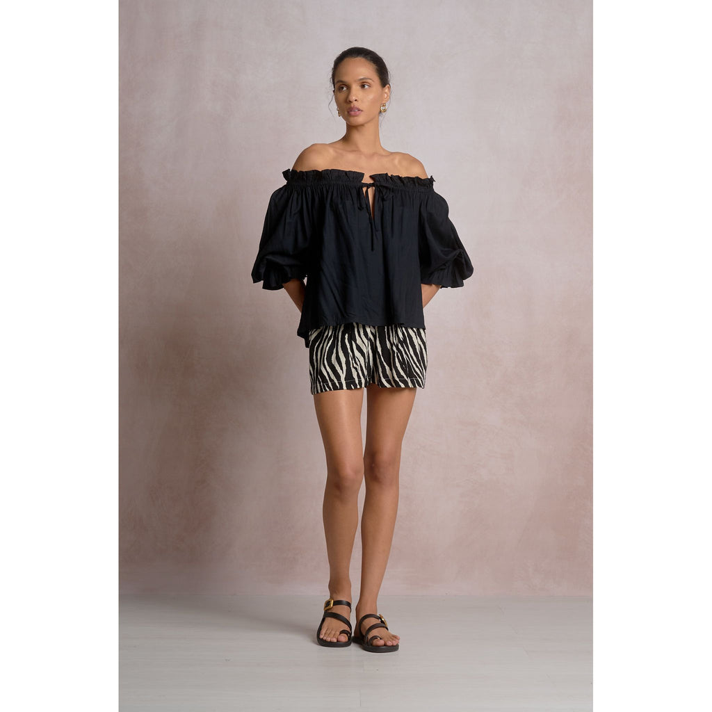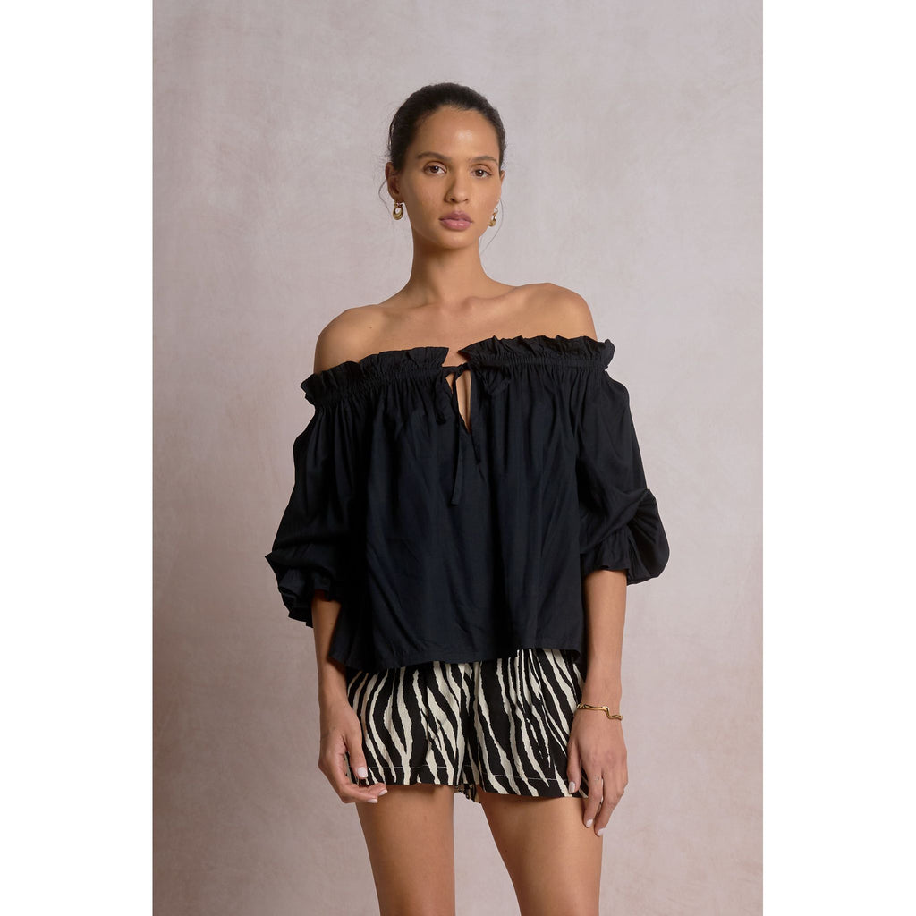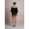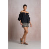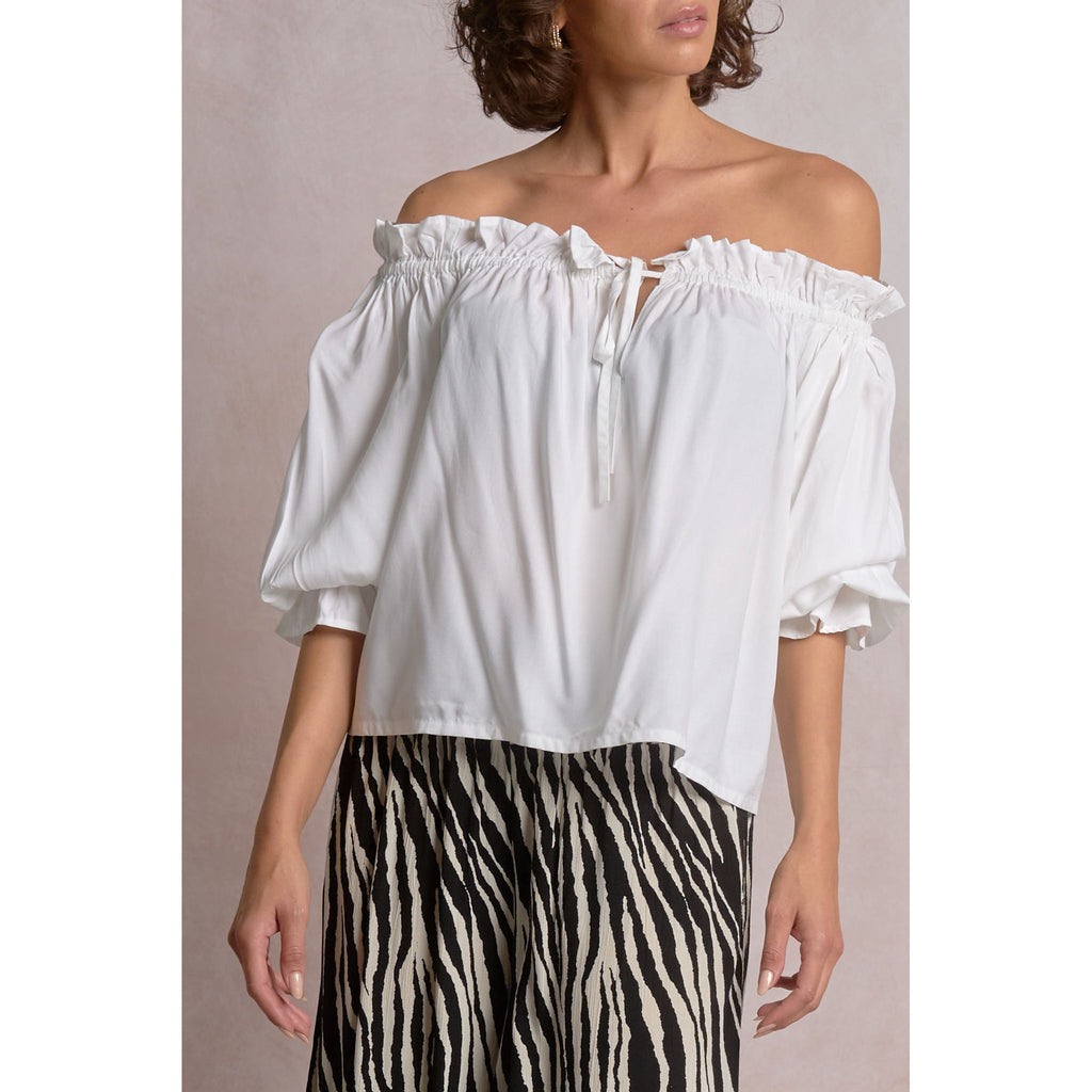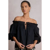 Flirty and fun, this off-shoulder beauty features charming bubble sleeves and delicate ruffles that add movement and personality. The flattering V-neckline is topped with an adjustable bow tie detail that lets you customize your look. Perfect for date night or making a statement at your next gathering.