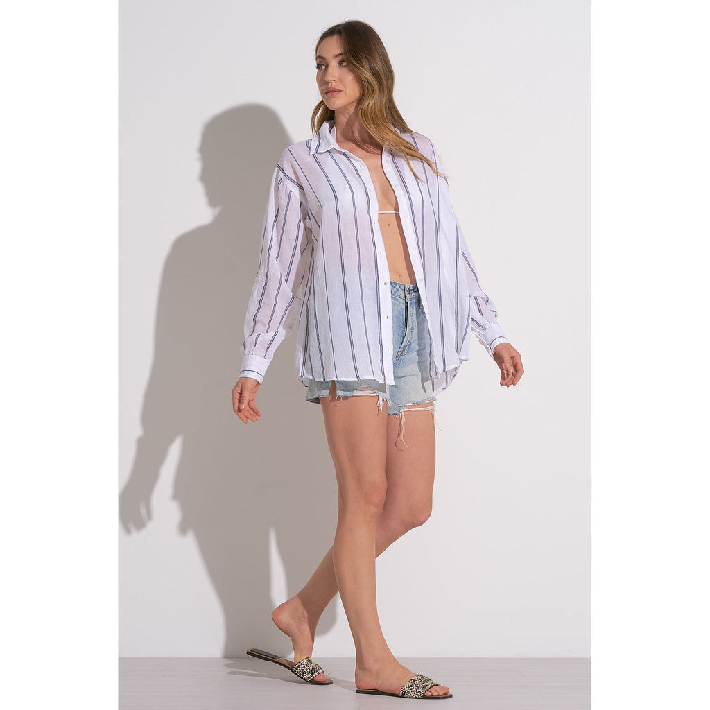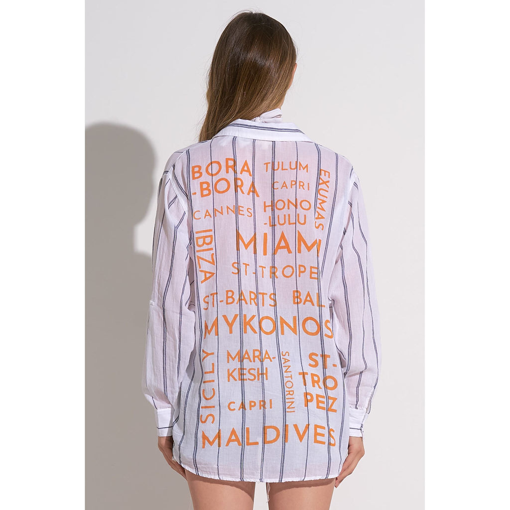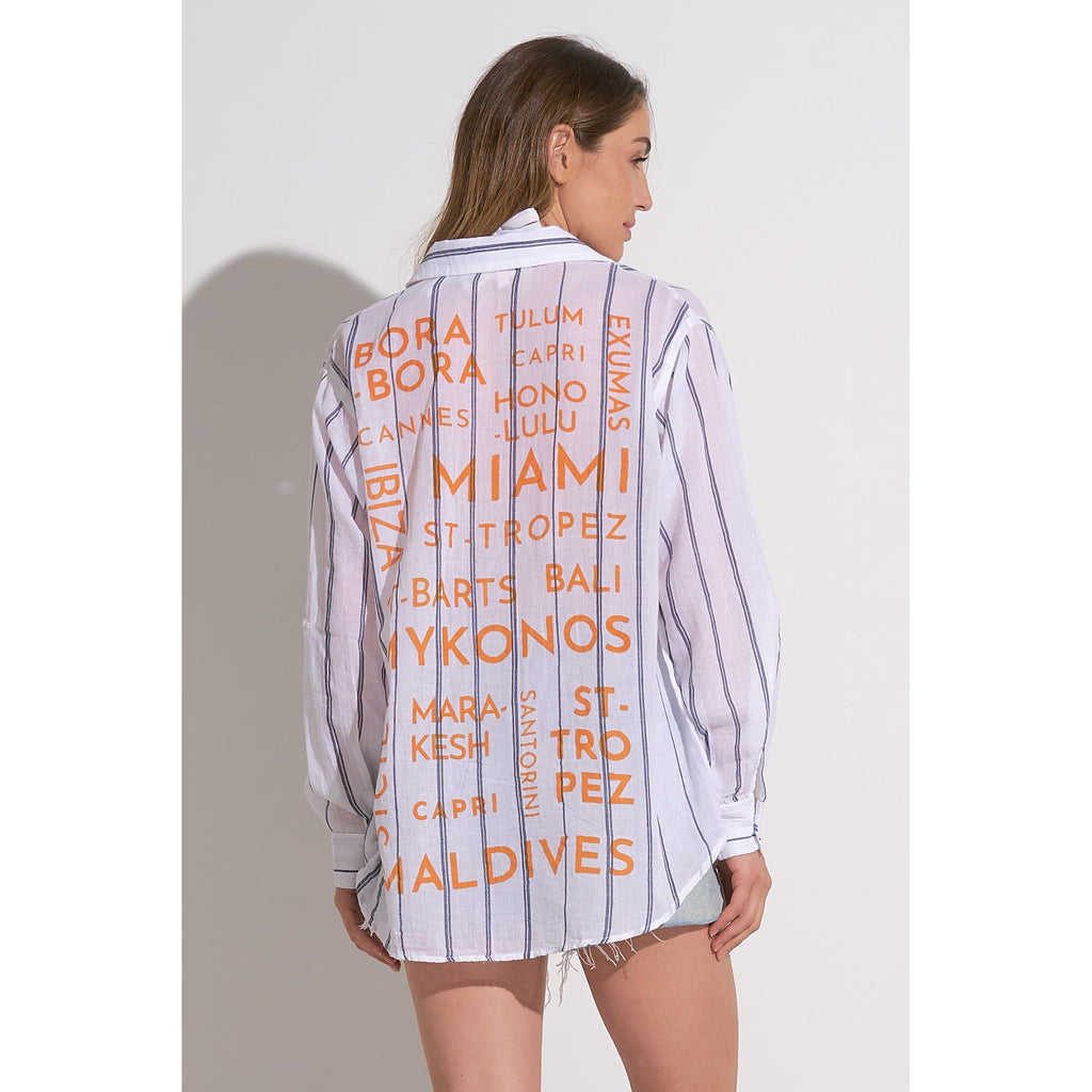 Meet Vista—the button-down that turns heads with eye-catching stripes and destination graphics splashed across the back. This isn't your ordinary shirt; it's a wearable passport that sparks joy whether you're layering it up or going solo. Perfect for those who crave adventure in their everyday style, Vista brings that breezy, globe-trotting energy to any outfit. Casual, chic, and unapologetically fun.