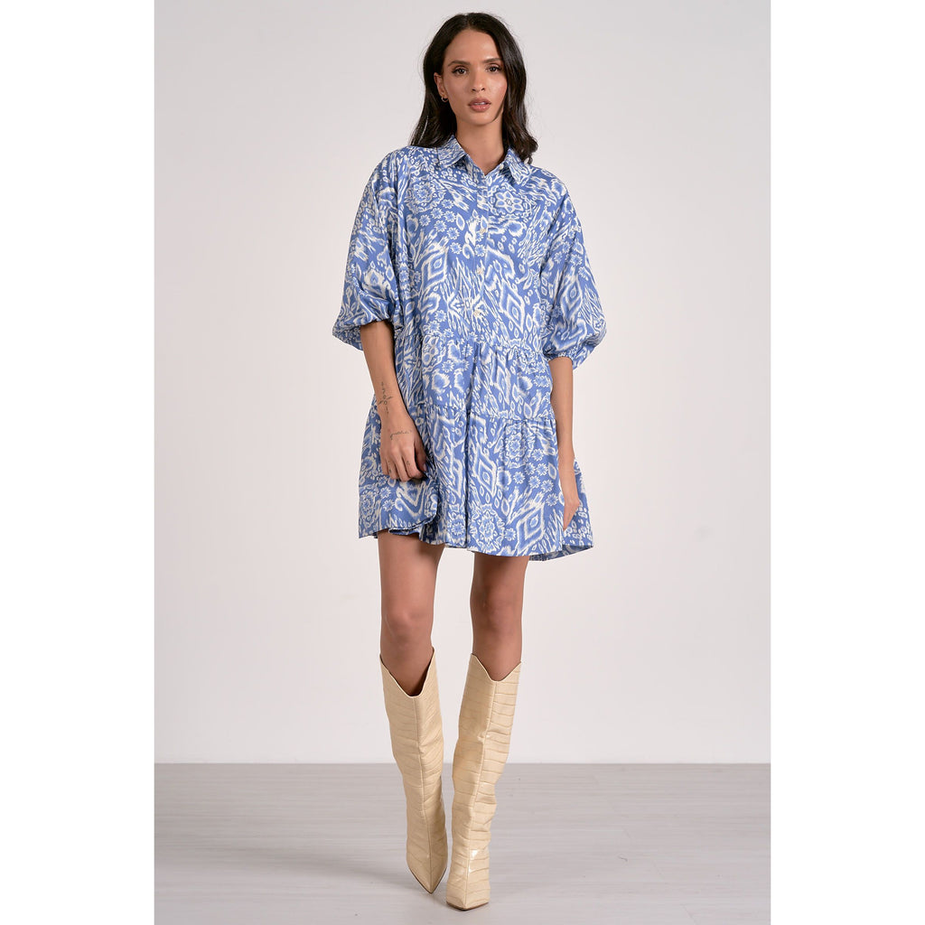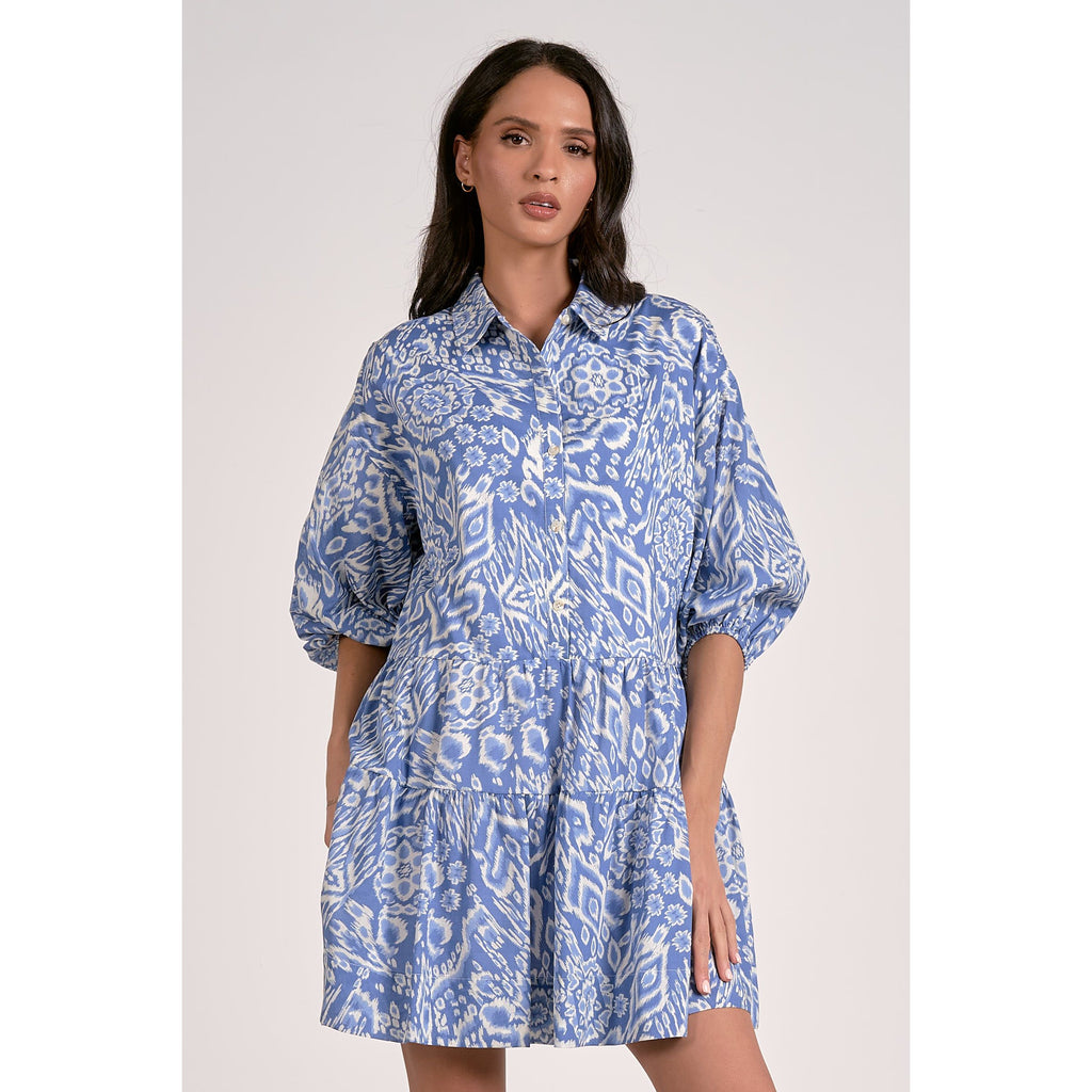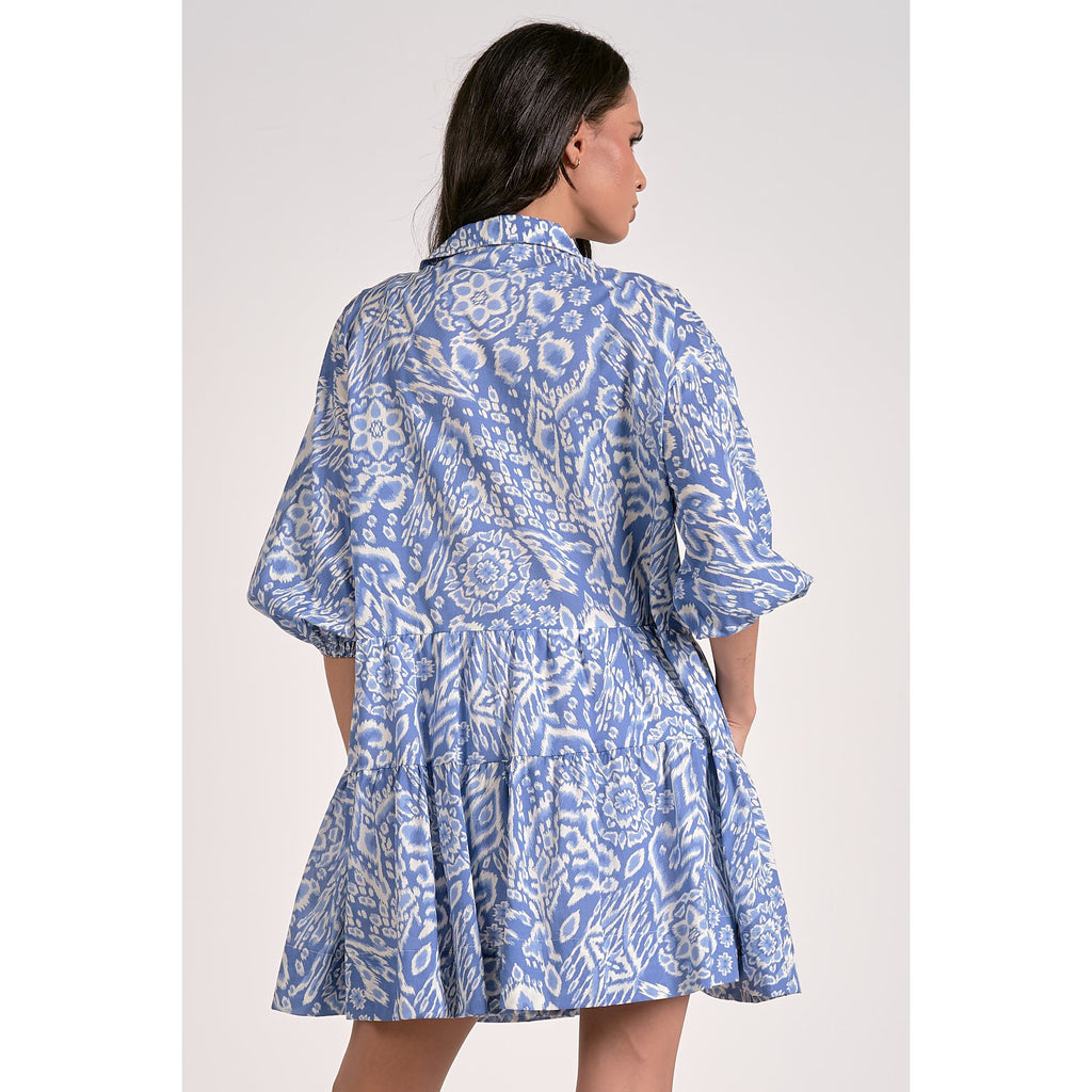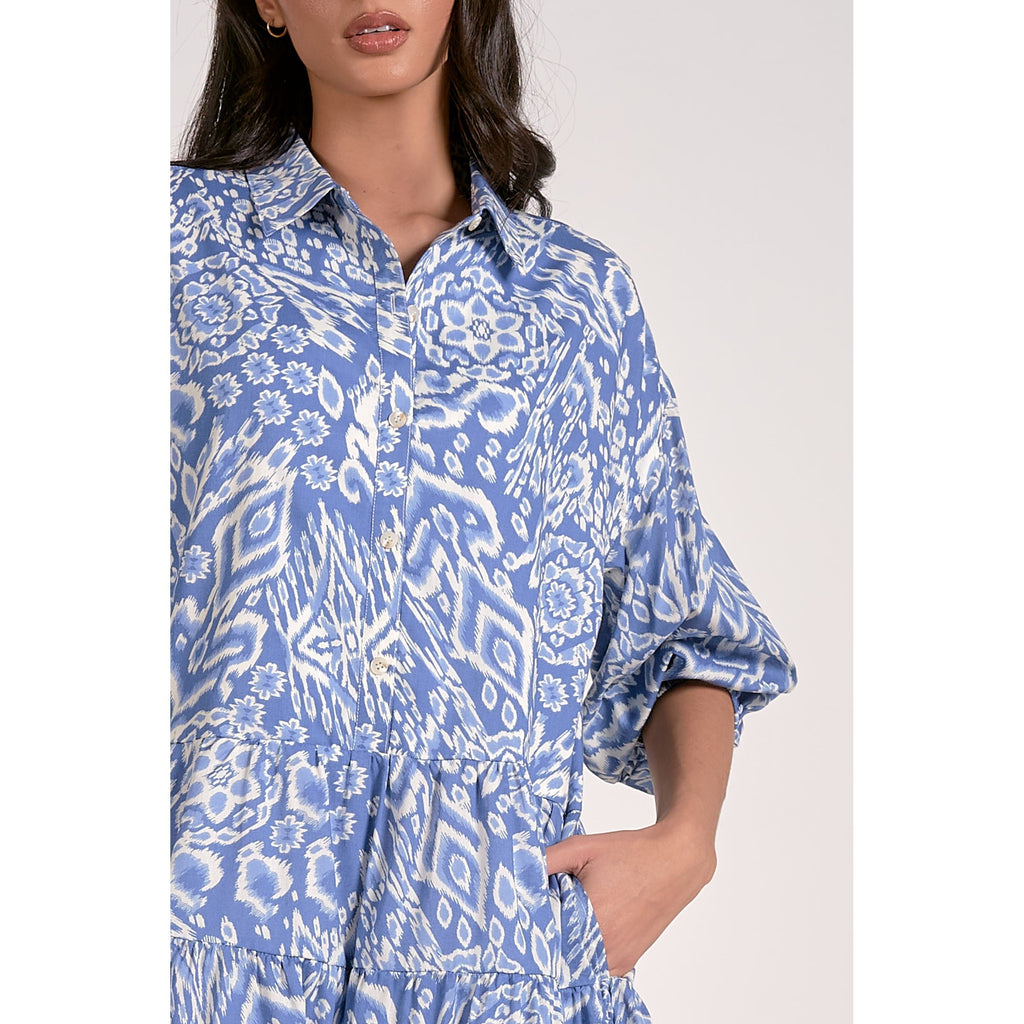 This dress features a collar, a playful ruffle tiered hem, and a button-up front with charming 3/4 bubble sleeves. Showcasing a detailed blue and off-white acorn pattern, it's perfect for pairing with tall boots to nail that fantastic fall vibe!