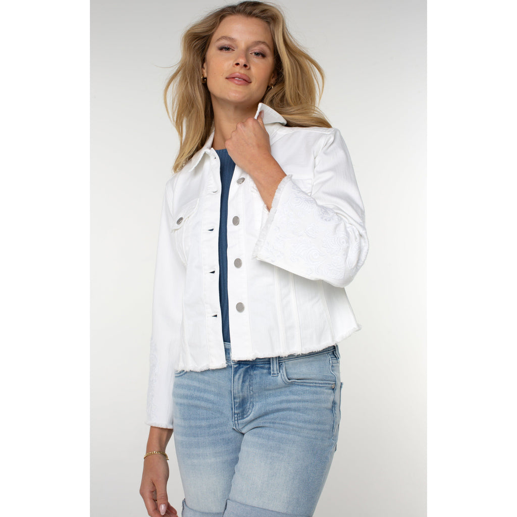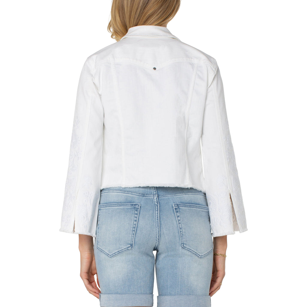 This crisp white crop denim jacket puts a fun twist on a timeless favorite. Featuring a flattering cropped cut, playful frayed hems, and detailed paisley embroidery, it adds a fresh, charming vibe to your denim lineup.