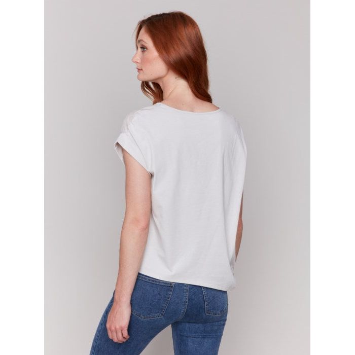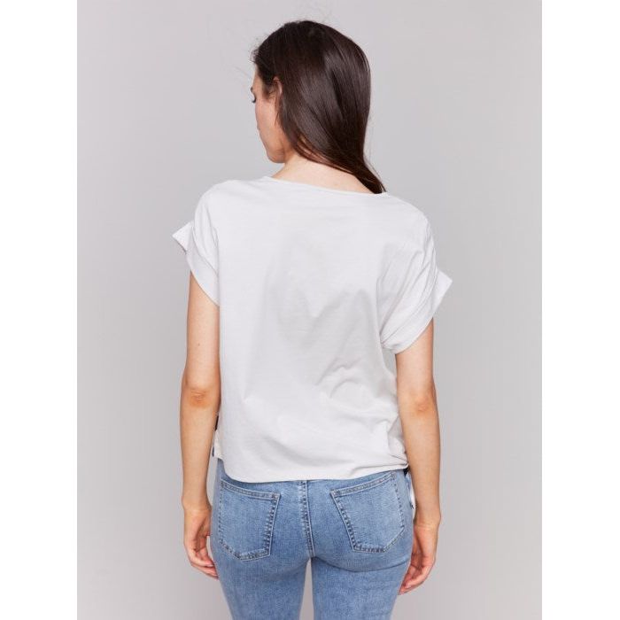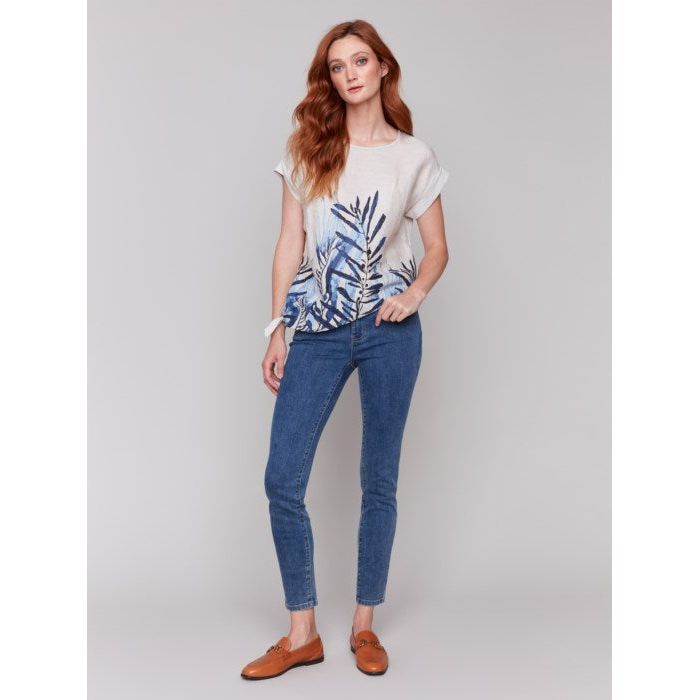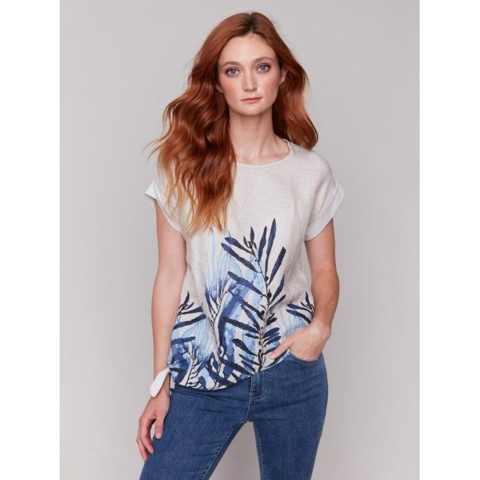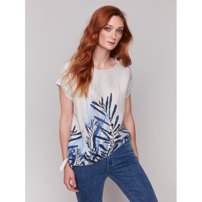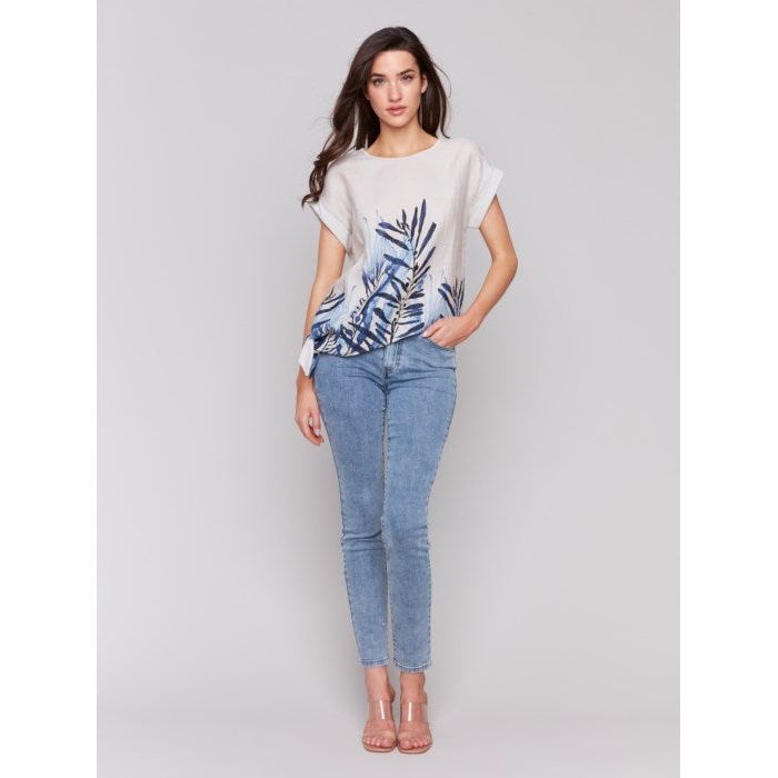 A luxurious linen blend top with a blue-hued leaf/palm print. Features short dolman style sleeves with folded cuffs and side knot tie detail. Looks fab with denim!