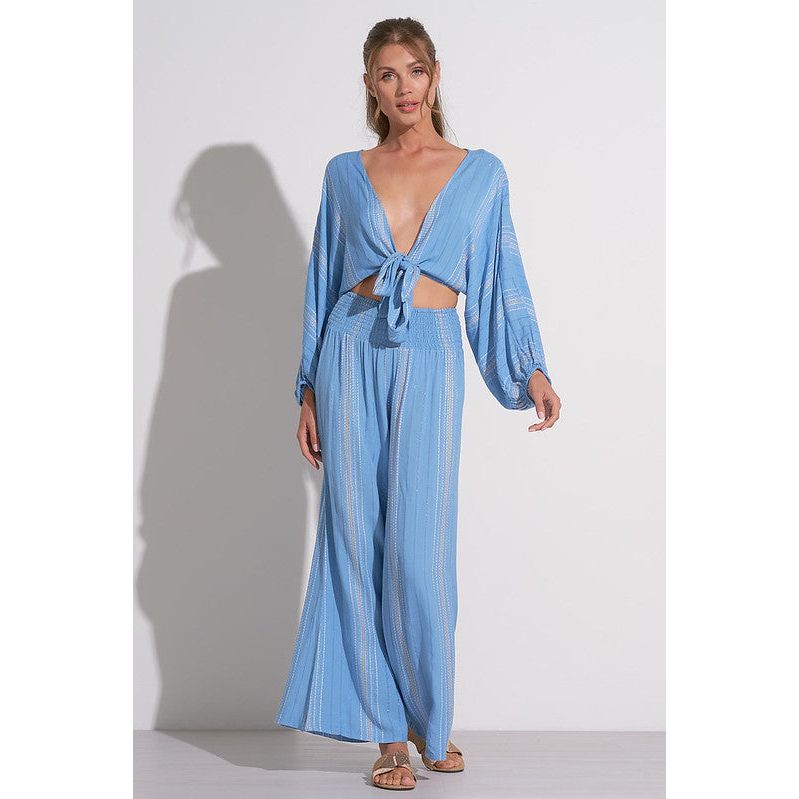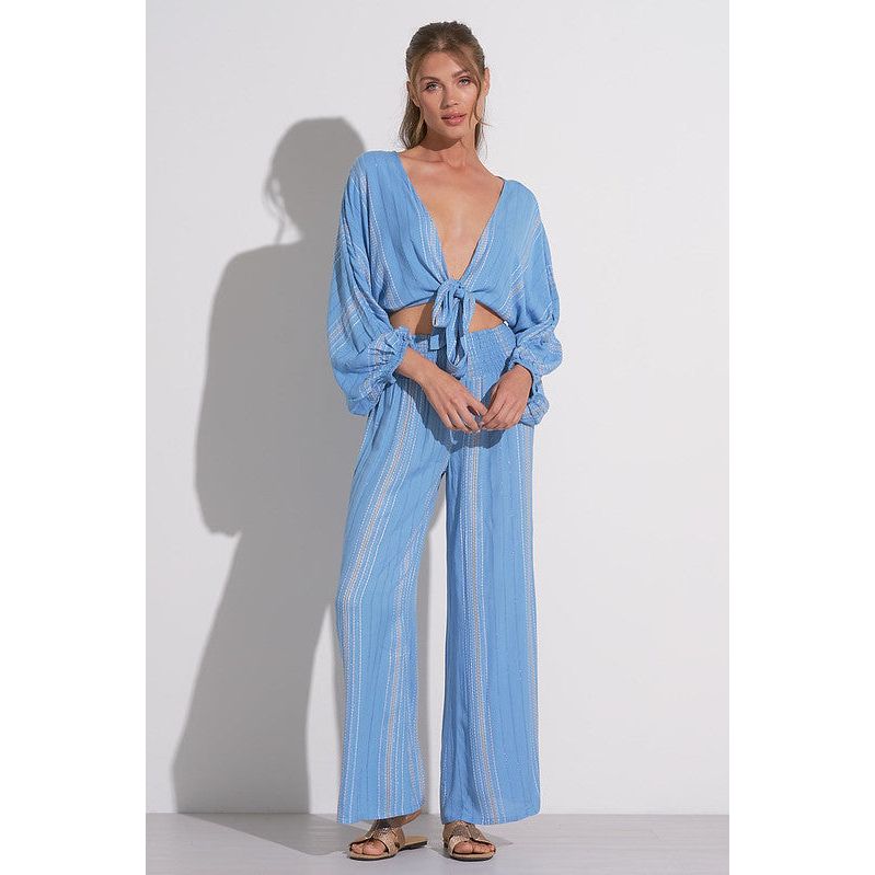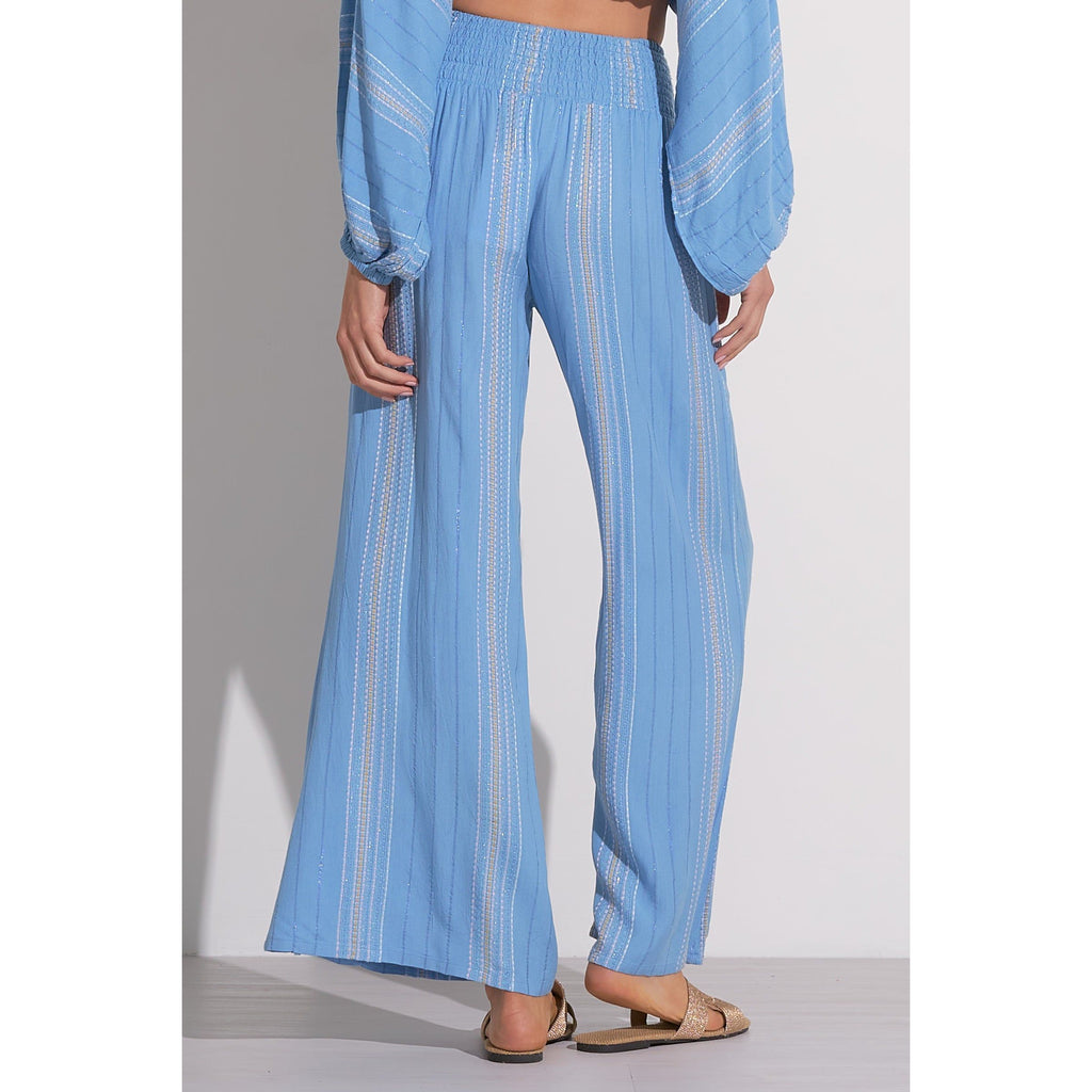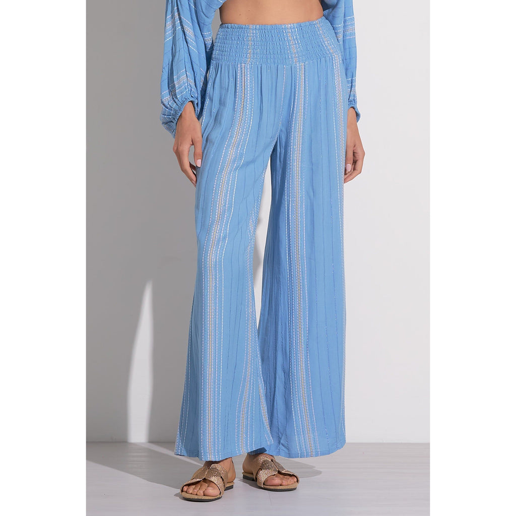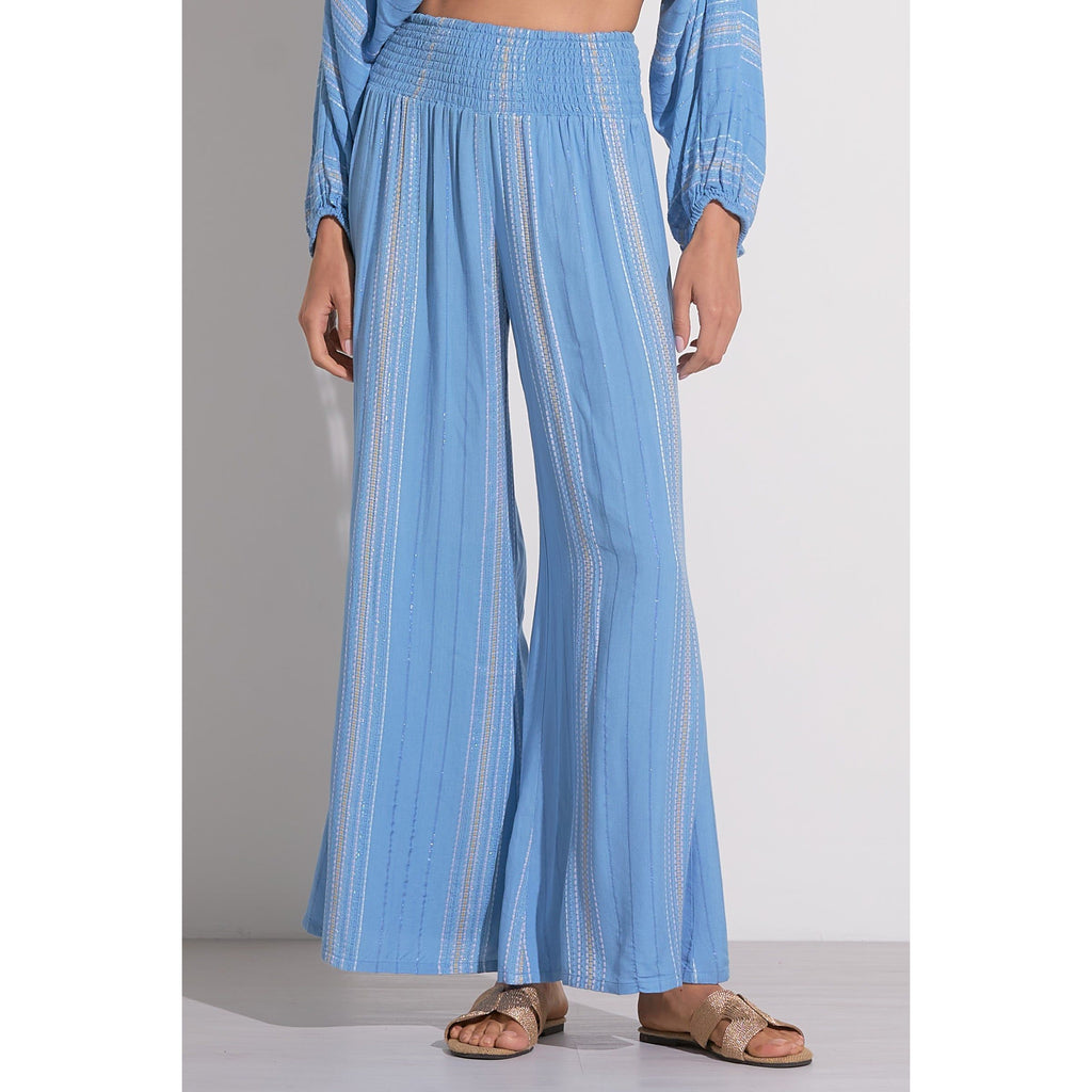 A flowy wide leg pant with a smocked waist for the ultimate comfortable fit. Features a beautiful striped threading detail throughout with a hint of sparkle from metallic yarn strings. Looks fab with the matching Blue Lilac Stripe Tie Front Top.