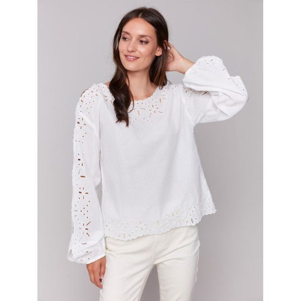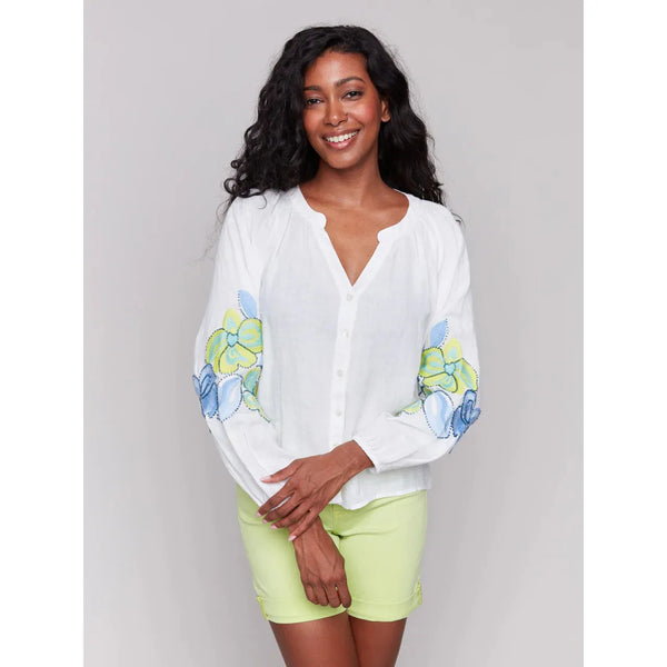 Linen Blend Button-Front Embroidered Blouse - Anise