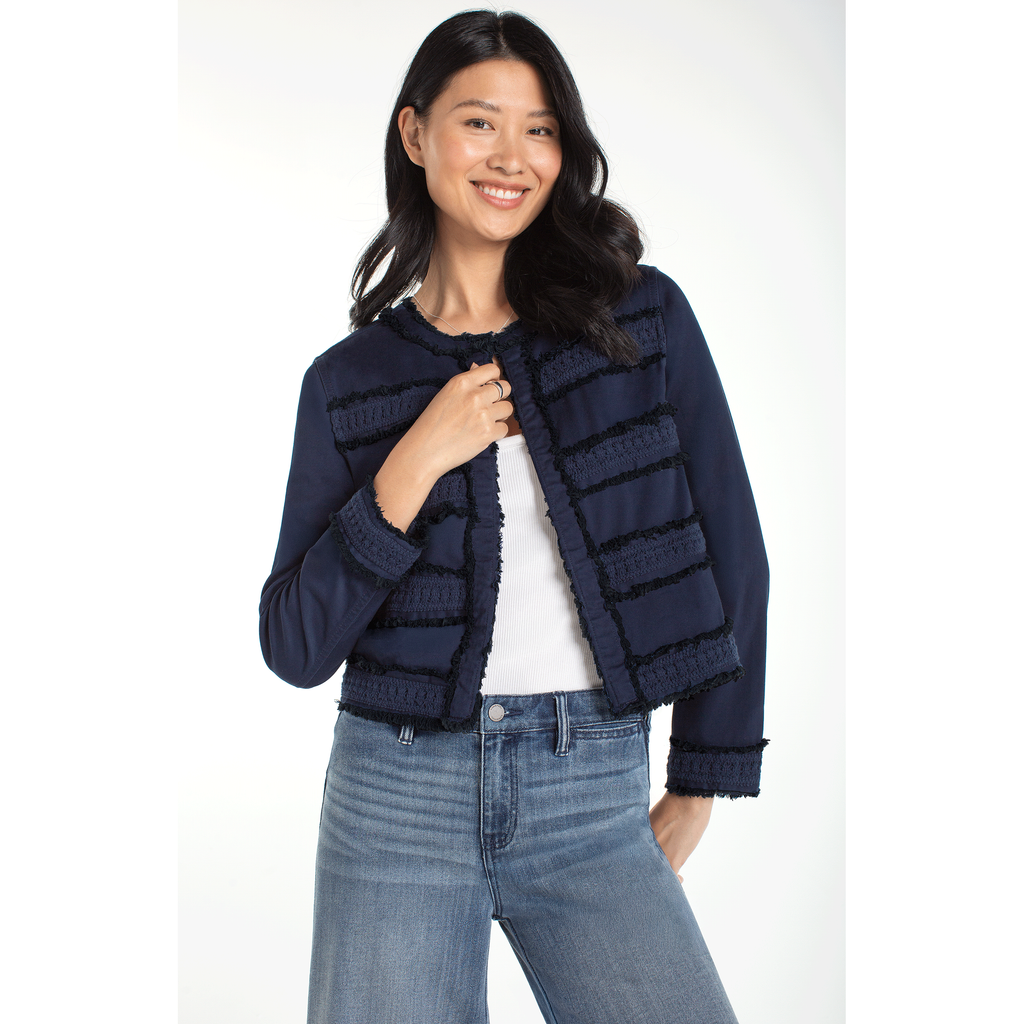 Forget boring blazers—this collarless jacket is where edge meets elegance. Frayed hems and delicate lace accents give it a refreshingly modern twist that feels anything but stuffy. Layer it over your favorite dress for instant polish or throw it on with jeans for weekend cool, it's so versatile. It's the kind of piece that works as hard as you do, whether you're conquering the boardroom or just conquering the day.