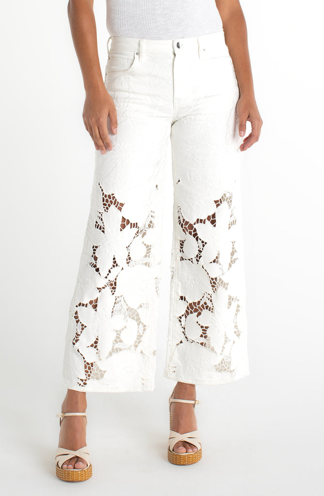 Elevate your denim game with these show-stopping wide-leg stride jeans featuring an all-over ivory bloom lace embroidery and die-cut design that's equal parts romantic and edgy. Cut to a flattering 30" inseam with classic five-pocket construction and belt loops. Perfect for making a statement without sacrificing wearability!