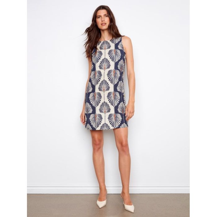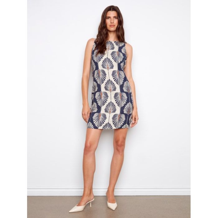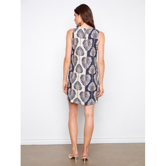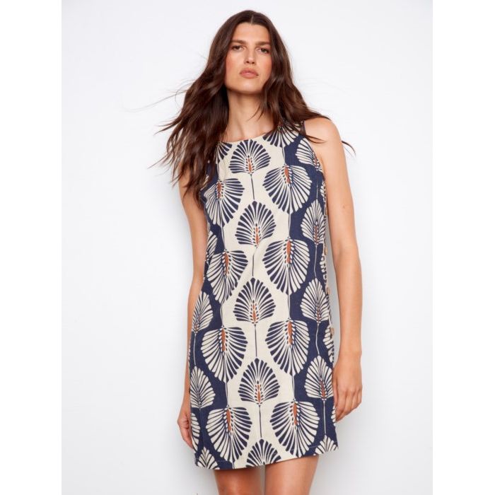 Escape to island vibes with this breezy sleeveless shift dress, featuring a stunning tahiti palm print in navy, copper brown, and beige. The playful decorative side buttons add a charming touch that's perfect for warm-weather adventures. Crafted in a comfortable linen blend, it's your go-to piece for effortless style that takes you from brunch to sunset strolls.