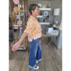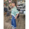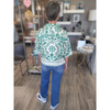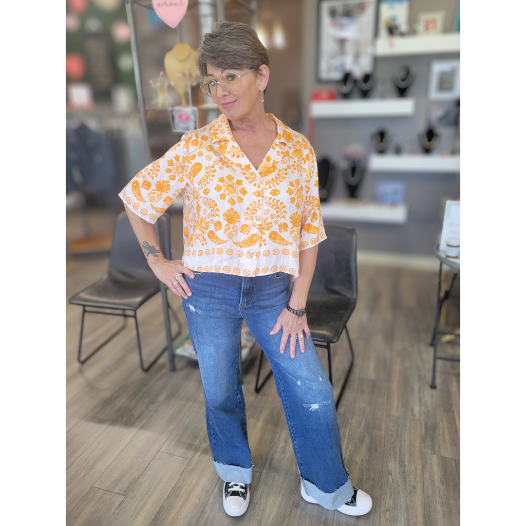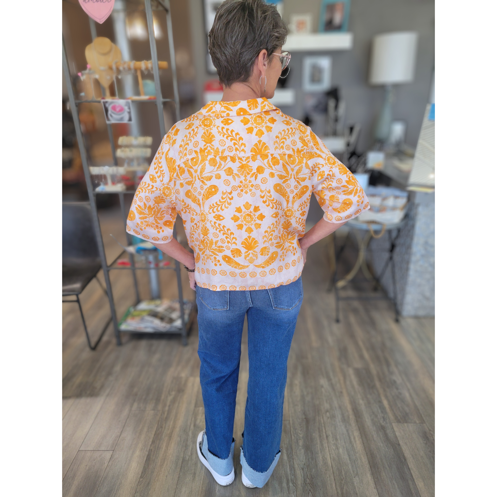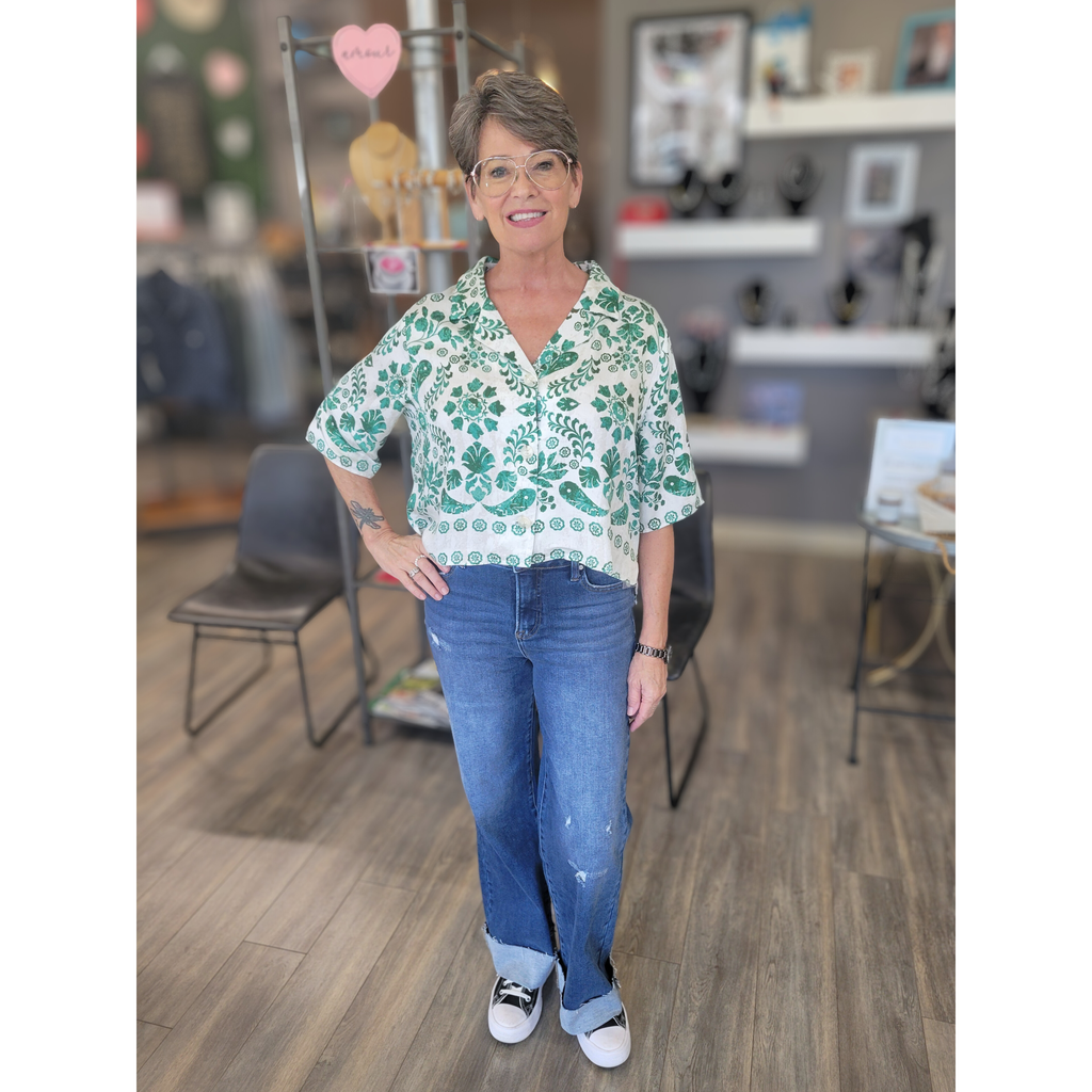 Rock a bold statement with this playful tribal printed shirt featuring a cropped silhouette and  hi-lo hem with side slit. The button-up front and collar keep it polished, while short elbow sleeves offer easy, breezy style. Choose between eye-catching vibrant green or warm tangerine to match your vibe.