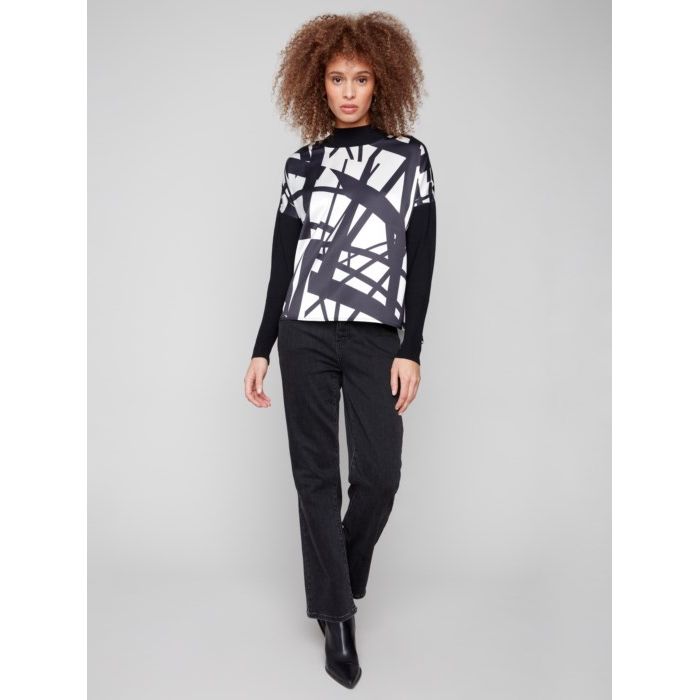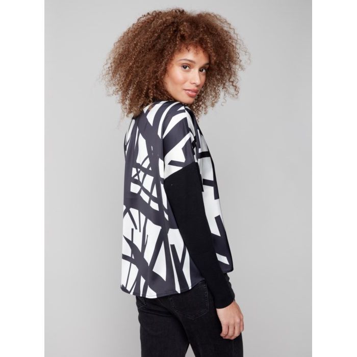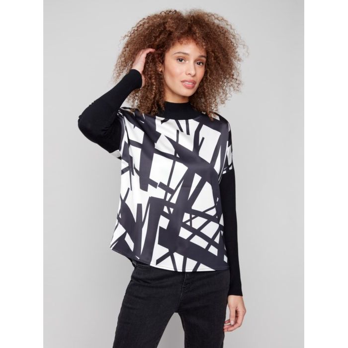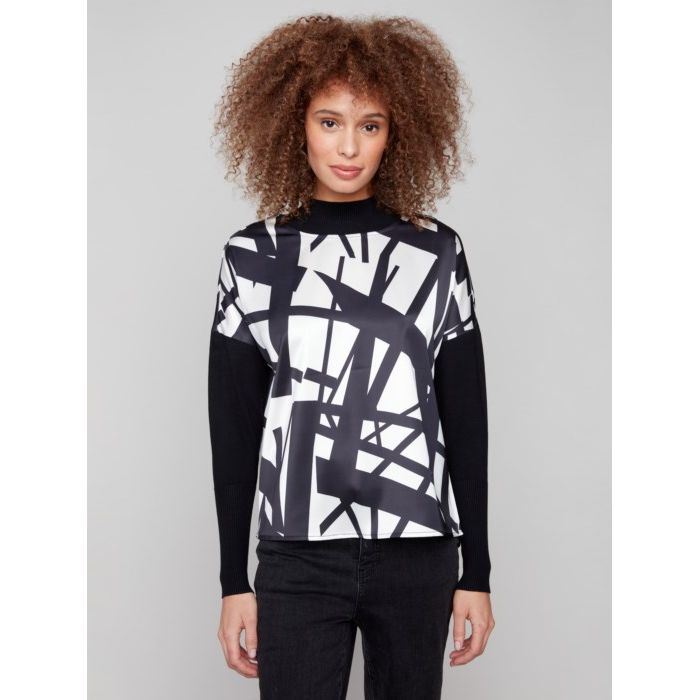 Discover refined style with our Printed Satin Knit Mock Neck Top! The captivating abstract black and cream print combines beautifully with soft stretch knit fabric that ensures comfort without compromise. The refined mock neck silhouette elevates any ensemble, making this piece an ideal companion to tailored separates for polished fall and winter looks.