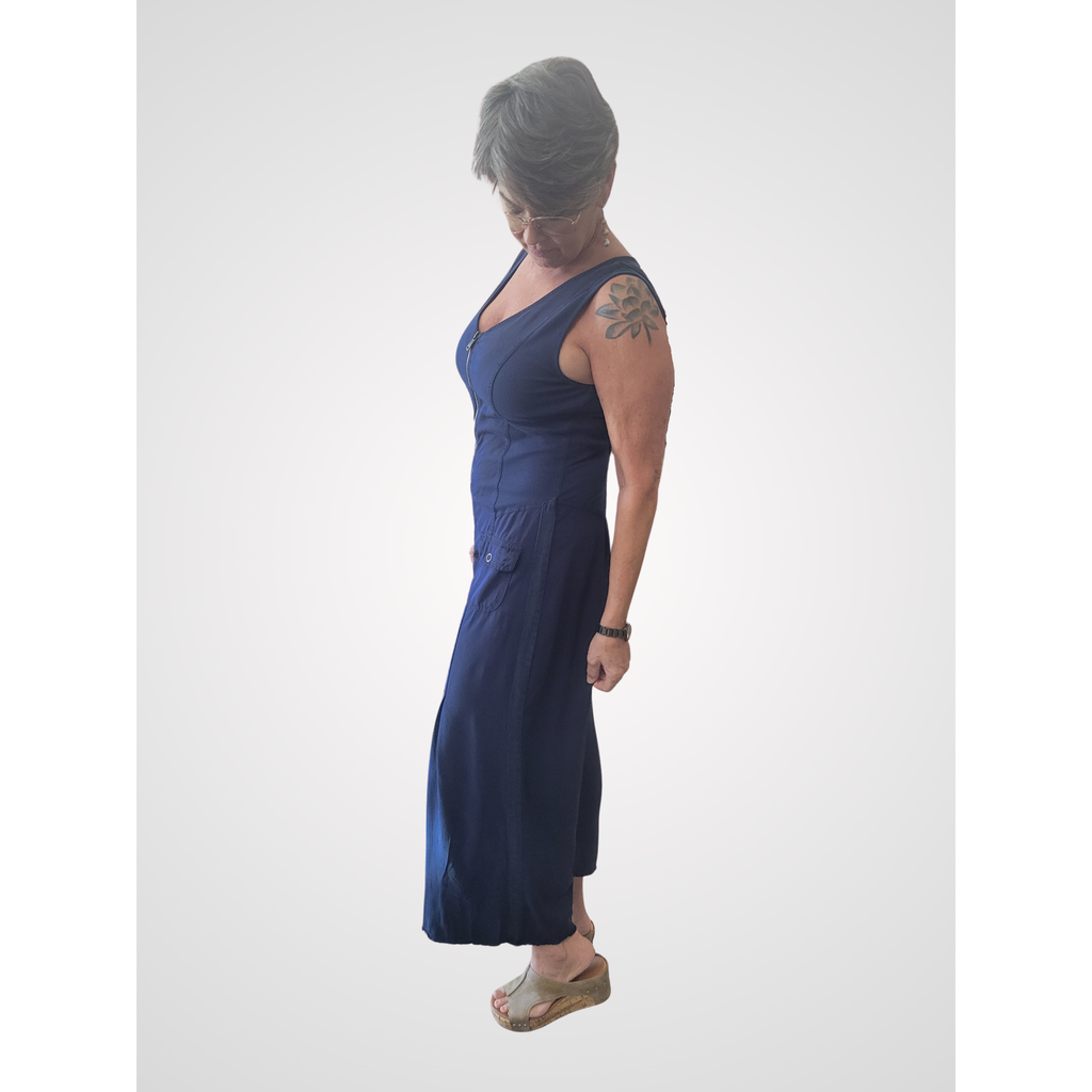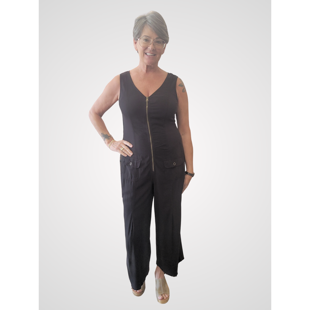 Bra-friendly tank straps flow into a flattering v-neckline finished with a brass zipper. Structured rib inserts create a contoured, flexible fit, while functional flap pockets and pleated cropped wide-leg silhouette complete the look. Crafted in luxuriously soft Taissa Twill, this is the jumpsuit you've been searching for.