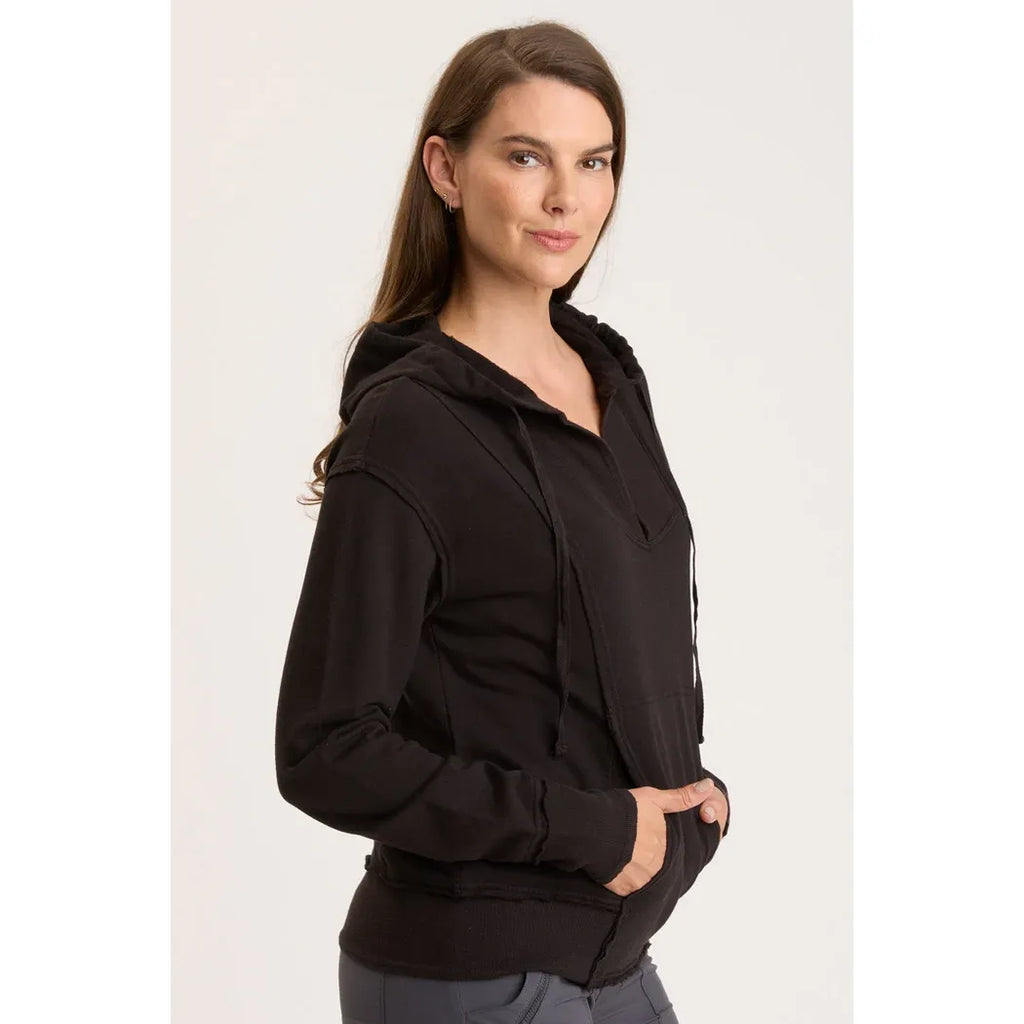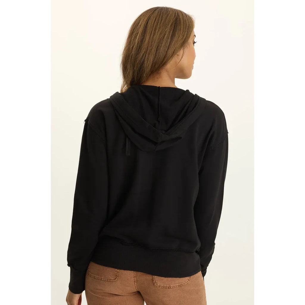 With its edgy raw hems and bold ribbed contrast, the Rosalyn Hoodie in Black is designed to steal the spotlight. Featuring a classic kangaroo pocket and sleek seams that flatter your figure, this hoodie is set to become your go-to style statement.