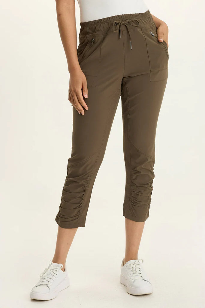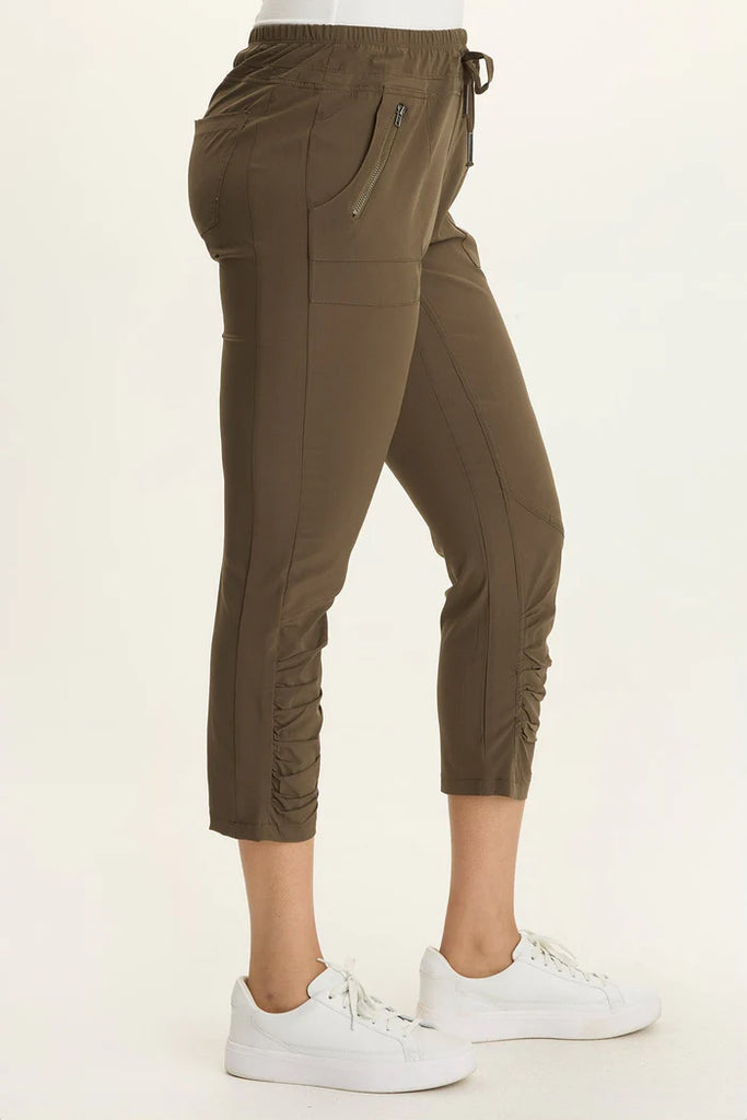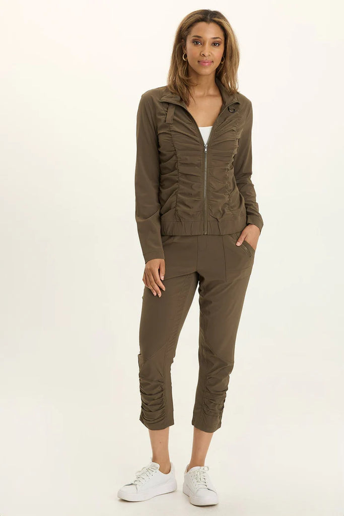 Designed for those who refuse to compromise on style or function, this active legging delivers serious attitude with its drawstring waist, zippered front pockets, and signature ruched leg panels. Back pockets keep your essentials close while the sleek silhouette moves with you through every workout and beyond. Perfect for anyone who wants their activewear to match their confidence.