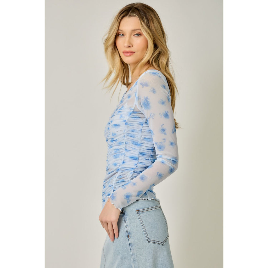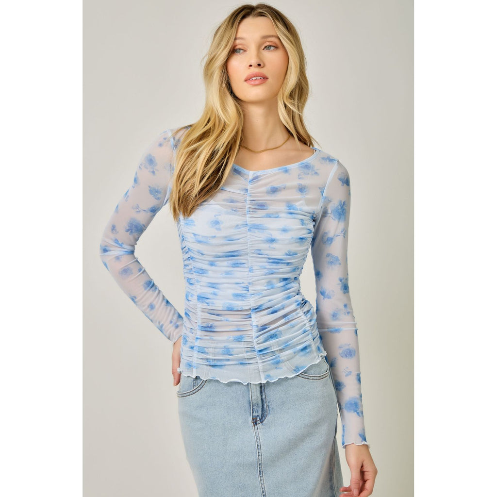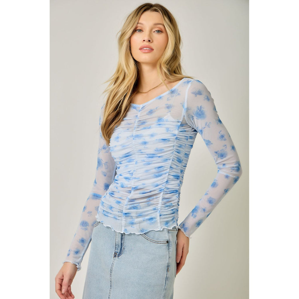 This breezy mesh top brings effortless style with its charming floral design and flattering ruched detailing across the front, sides, and back. The V-neckline and long sleeves make it perfect for layering, while the delicate lettuce hem adds a touch of whimsy. Dress it up or down for endless outfit possibilities.