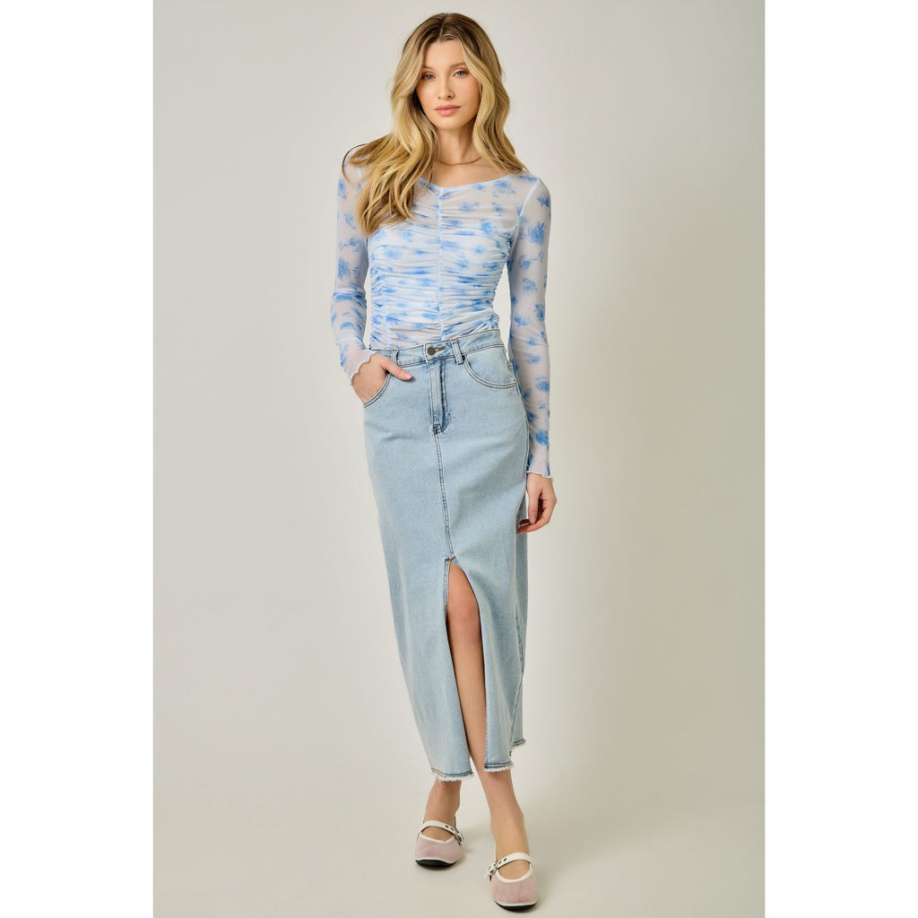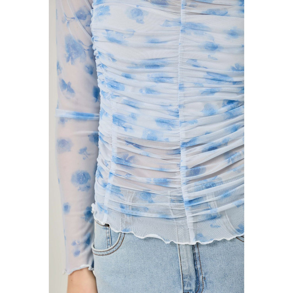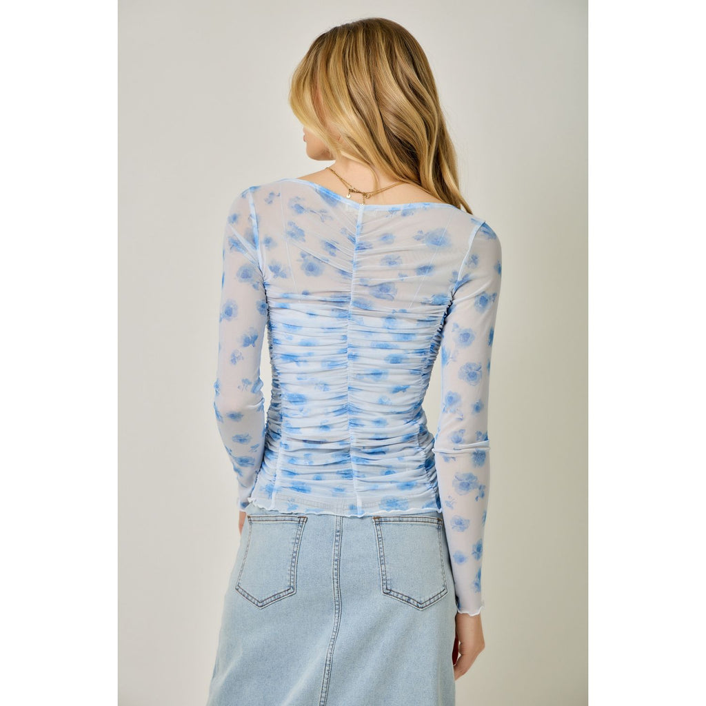 This breezy mesh top brings effortless style with its charming floral design and flattering ruched detailing across the front, sides, and back. The V-neckline and long sleeves make it perfect for layering, while the delicate lettuce hem adds a touch of whimsy. Dress it up or down for endless outfit possibilities.