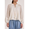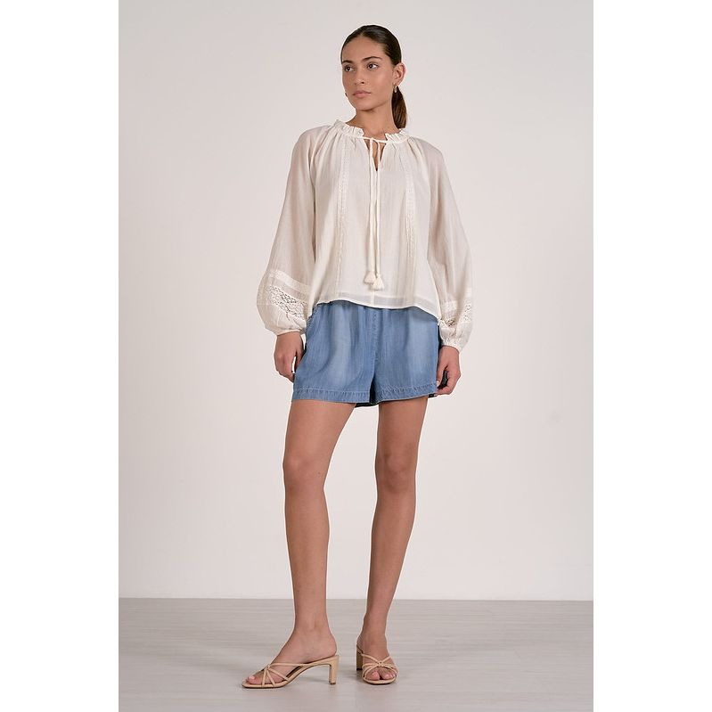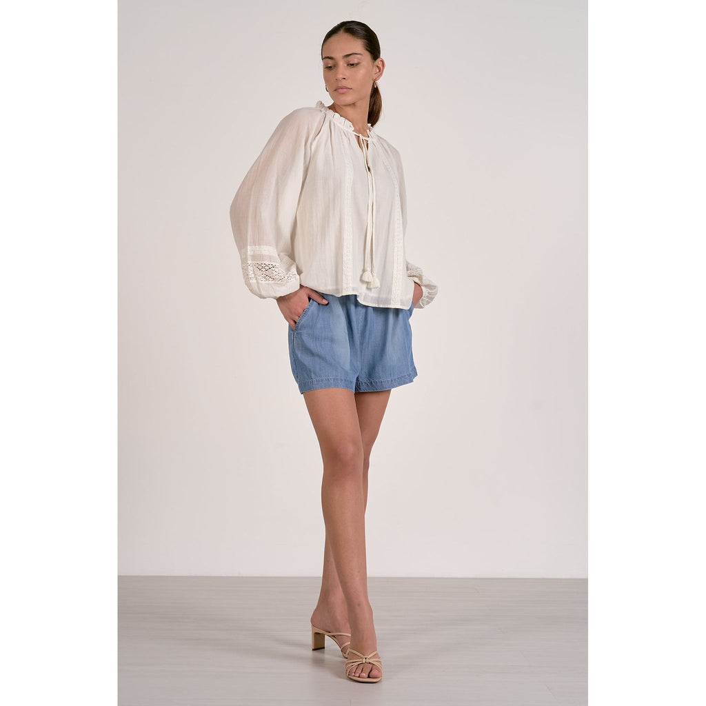 Embrace your free-spirited style with this charming boho blouse that's equal parts romantic and effortless. Billowing sleeves cinch at the wrists for a dreamy silhouette, while the ruffled neckline features a playful v-notch and tassel tie that begs to be styled your way. Delicate embroidery and lace accents dance across the fabric, adding texture and visual interest. Crafted from lightweight, breathable cotton with a shell and lining, this piece keeps you cool and comfortable all day long. Mix, match, and reinvent—this versatile beauty works as hard as your imagination does.