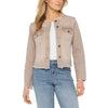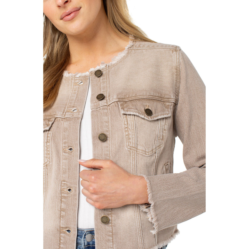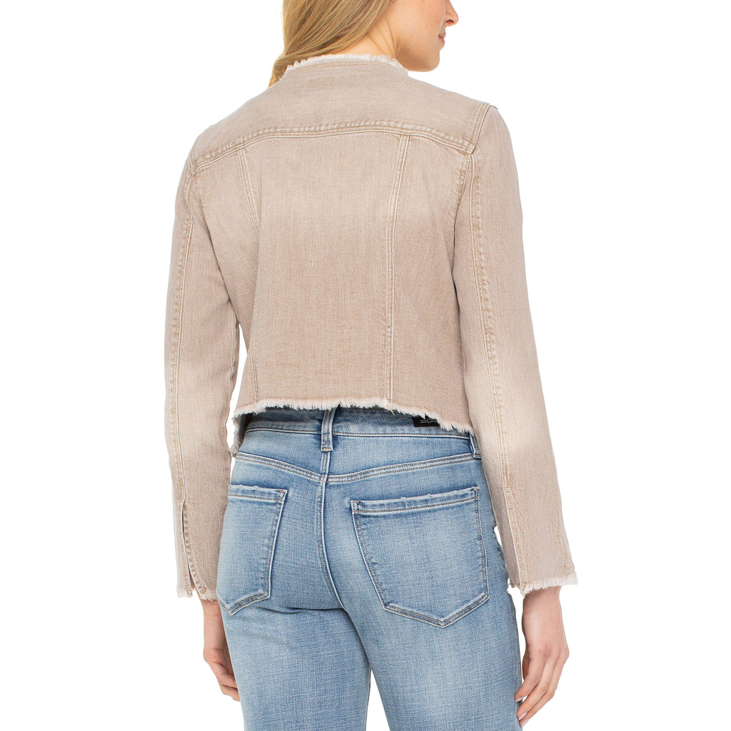 This is no ordinary denim jacket! This playful piece stands out with its collarless cut, frayed edge hem, and fun split cuffs. It features handy chest and slant pockets for your essentials. Crafted from Liverpool’s eco-friendly soft stretch denim, it offers comfy fit and great shape retention.