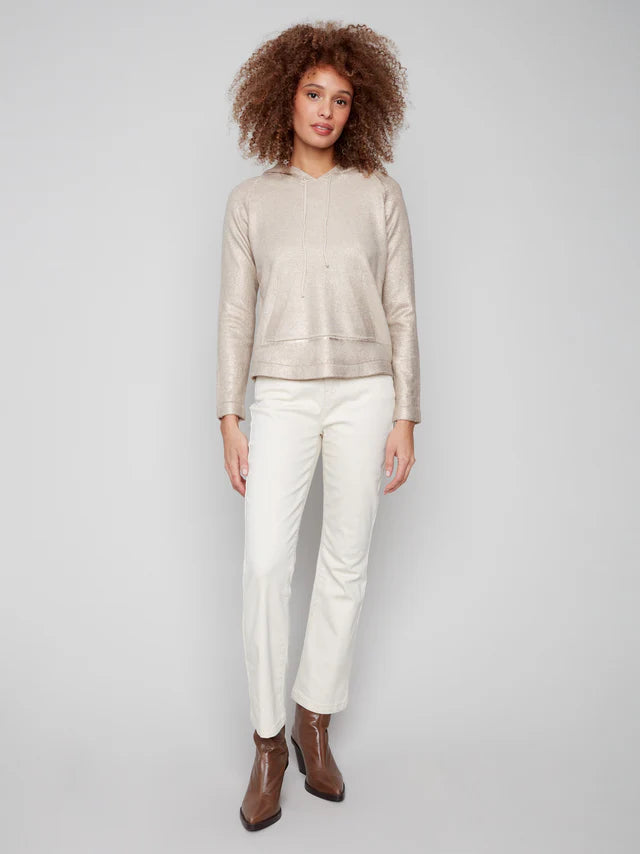 Effortlessly shine this fall with this Metallic Knit Hoodie Sweater in a beautiful champagne beige color. Its soft texture and gentle shimmer make it a standout top in any wardrobe. Ideal for bringing elegance to your everyday look, its long sleeves and adjustable hood offer both comfort and style.