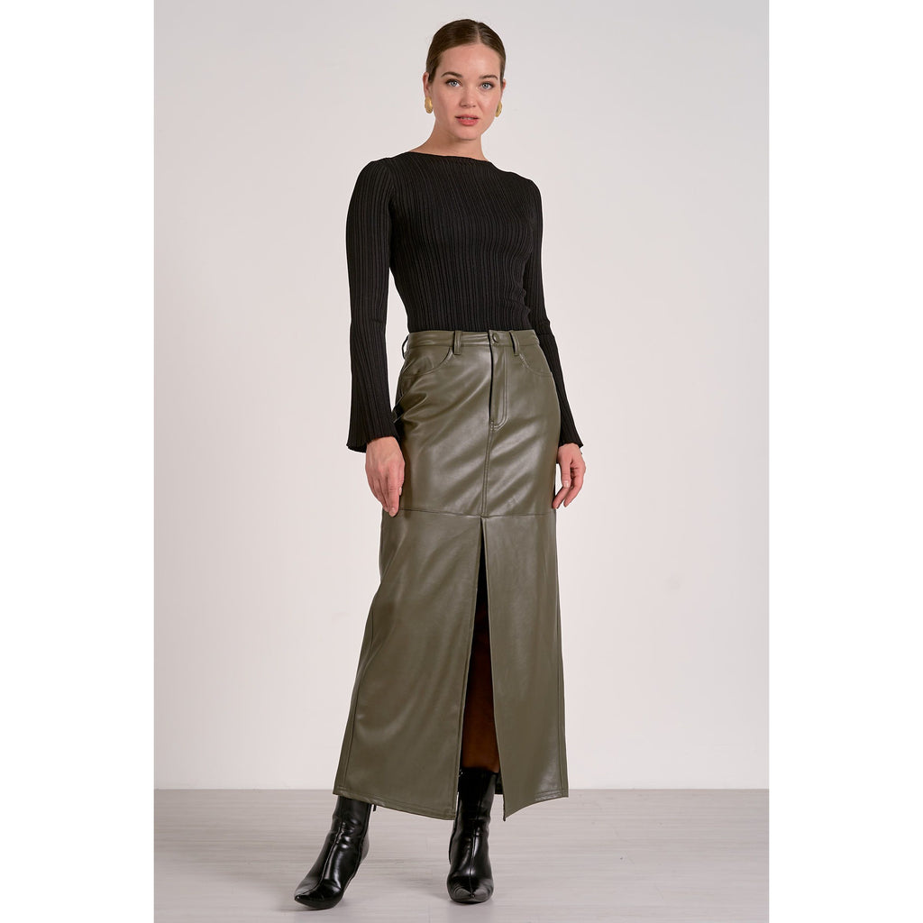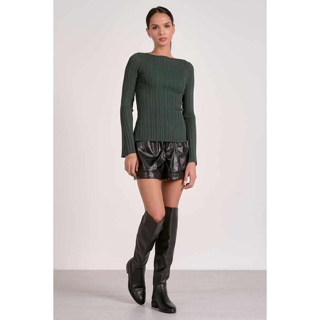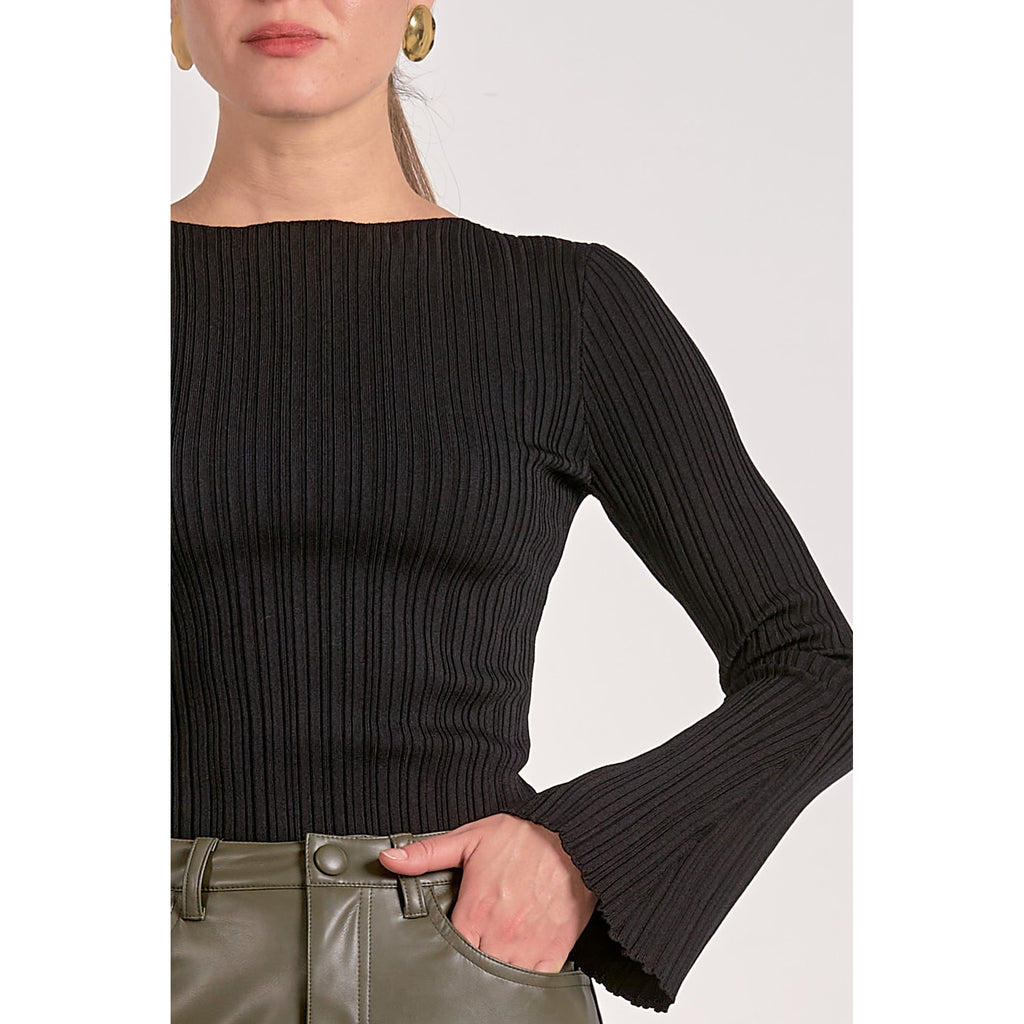 This stylish top will quickly steal the spotlight in your fall wardrobe with its soft ribbed knit and stretchy fit. It boasts a cozy high crew neck and fun, flared long sleeves that add a touch of flair. Perfect for layering or pairing with your favorite skirts, jeans, or shorts. Choose from timeless black or refreshing pine green to brighten your look!