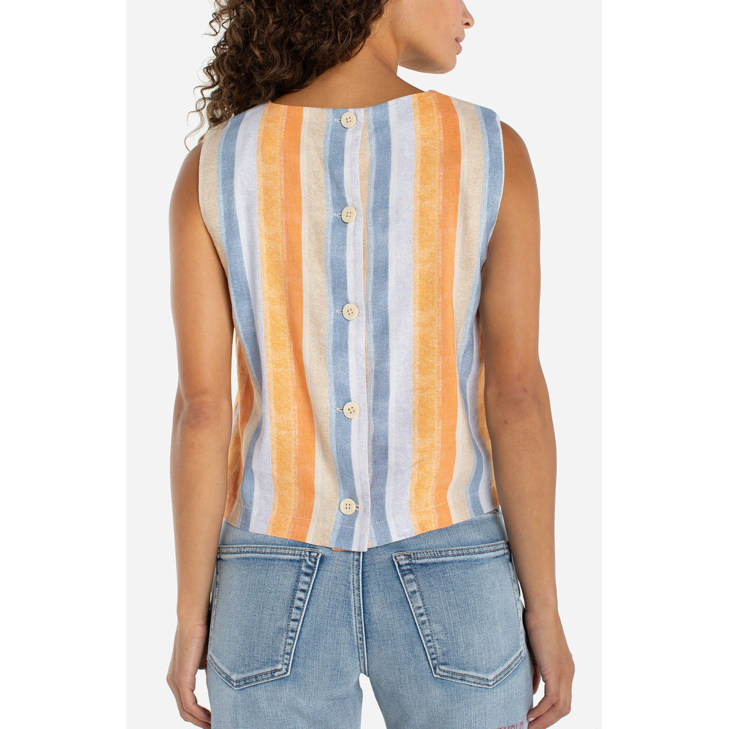 Playful pastels meet practical style in this sleeveless shell top, featuring a charming multi-color stripe design that screams spring. The button-up back adds an unexpected twist, while strategic front darts create a flattering silhouette. Crafted from lightweight, breathable fabric with just enough stretch to keep you comfortable all day long.